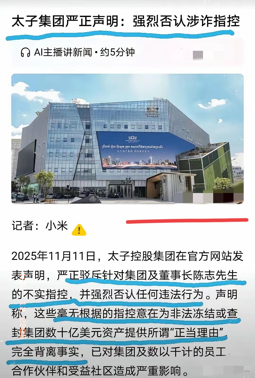 惊天冤案? 还是惊天局中局? 名动天下的太子集团, 开始了反击,强烈否认涉诈指控。 惊不惊喜,意不意外? 嘴上喊着“清白”,可多国冻结的超千亿资产、内地法院早已生效的涉赌判决,还有诈骗园区的受害者证词,哪一个不是实打实的疑点。 所谓“反击声明”更像一场公关秀,说指控是为了“非法查封资产”,却避谈跨境洗钱、诈骗招工的核心问题。真要自证清白,就该把资产流水、业务合规文件摆出来,而不是只靠国际律所撑场面。 跨境犯罪最擅长“表面慈善、背后敛财”,太子集团的否认越激烈,越让人觉得是欲盖弥彰。法律从不会冤枉好人,但也绝不会放过任何一个钻空子的黑产巨头。 你觉得太子集团能拿出真正的“清白证据”吗?评论区聊聊你的判断~
