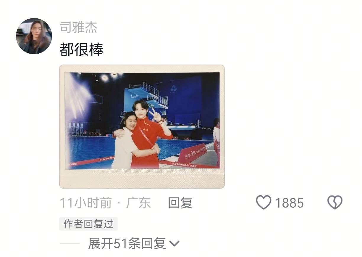 全红婵:没有白走的路,对错都是我的脚印。“都很棒”、“队友很棒”,司雅杰、崔宸曦、傅园慧、陈志朋评论区送暖心祝福。