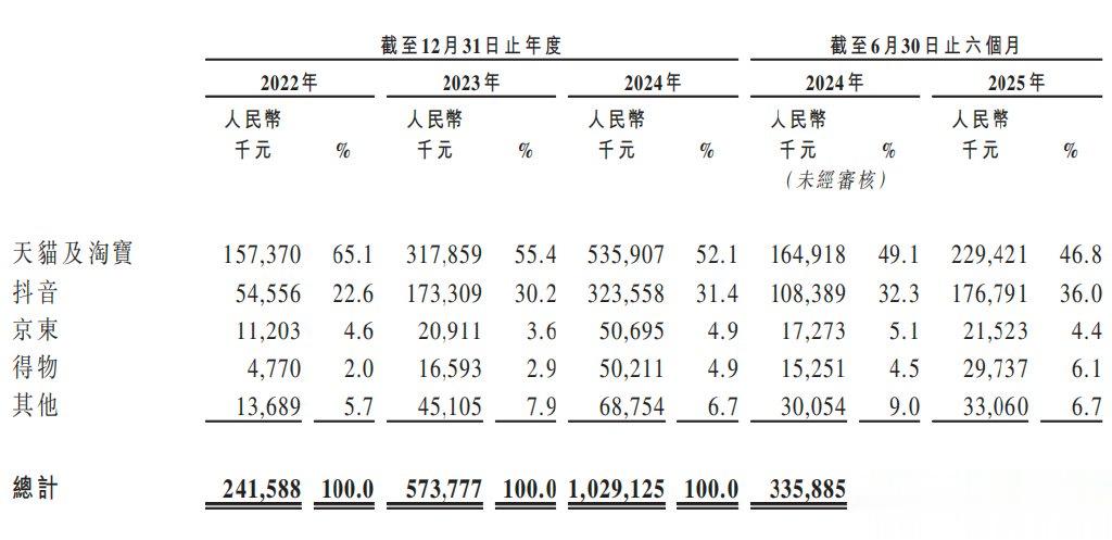 其中,天猫及淘宝自营店铺是伯希和主要线上渠道,收入从2022年的1.57亿元增加至2023年的3.18亿元,并在2024年增至5.36亿元。来自抖音的收入也增长迅速,分别为5456万元、1.73亿元、3.24亿元。2025年上半年与去年同期相比,天猫及淘宝自营增长38.79%至2.29亿元,抖音增长63.89%至1.77亿元。