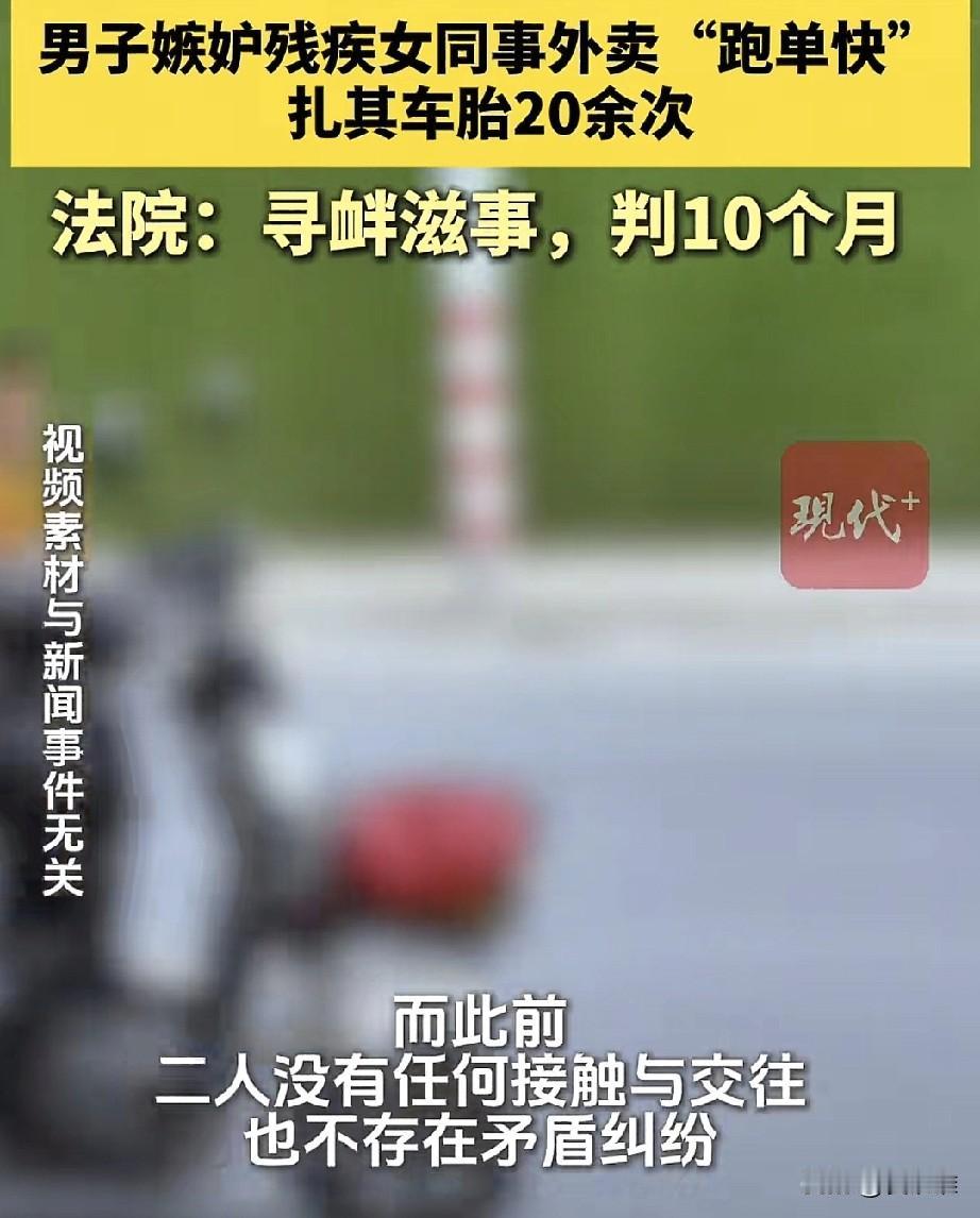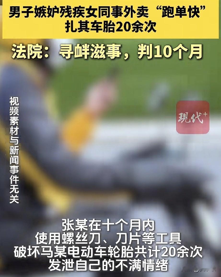 “判的好!”外卖员张某因投诉率过高被迫离职,离职后他在街上偶遇了曾经在同一站点工作的女同事马某,马某虽然是一名二级肢体伤残的残疾人,但凭借任劳任怨,服务态度好,是站点的跑单王,而这一点恰恰刺痛了内心狭隘的张某。偶遇后张某尾随马某进入她所租住的小区,认准了她的车牌号随后返回家中携带螺丝刀,刀片来到马某所在的小区,把她赖以生存的电动自行车轮胎割破,几个月时间前后做案20多次。被多次割破轮胎的马某后来才意识到是有人故意所为,于是报警,民警通过小区监控锁定了张某,被抓获后张某交代自己与马某无冤无仇,并无交集,生活中遇到不顺就想发泄出去,而那次偶遇后马某就成了他的发泄对象。法院审理后认定,张某行为恶劣,犯故意寻衅滋事罪,被判处有期徒刑十个月! 我想说:张某心胸狭窄,自己无能却是满脑子的坏心思,千方百计去破坏他人,造成社会恶劣影响,罪有应得判得很好!
