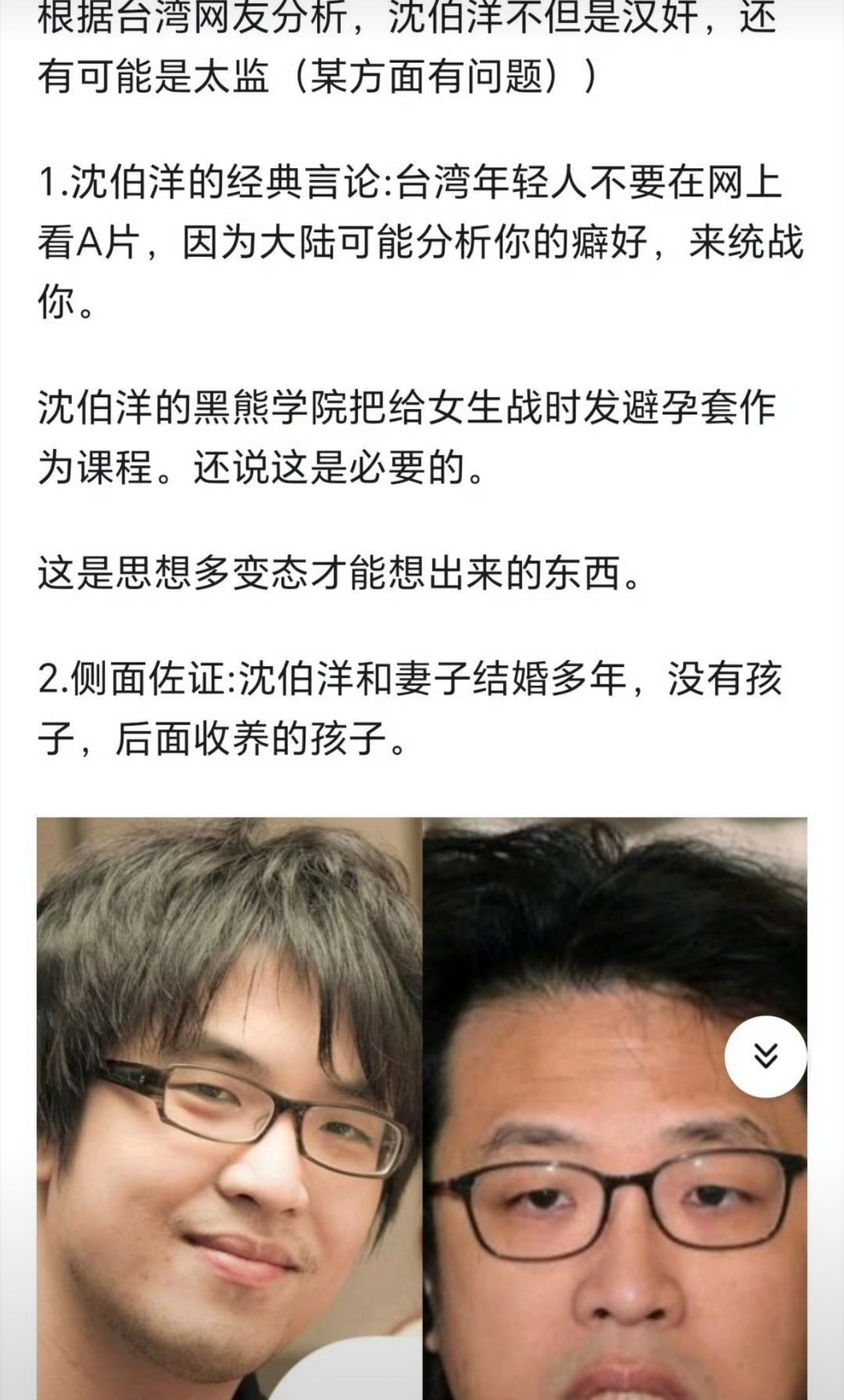 哎呀我的妈呀,真的假的啊,台湾网友爆料:沈伯洋不仅是汉奸,还有可能是太监!夫妻多年没生育,还告诉台湾网友不要网上看a片,免得被大陆分析癖好统战!给女生战时发避孕套是黑熊学院必修课!这怕是变态的太监吧!捉到他的时候麻烦体检全面一点!别让他在狱中搞事情[捂脸][捂脸][捂脸][捂脸]