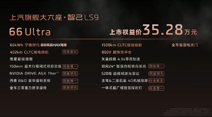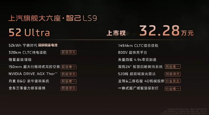 32.28-35.28万的六座后轮转向智己LS9太香了 比预售价低了接近1w,诚意满满的。这价格对于领克900、理想i8来说,都是比较大的威胁的。别看这是台增程车,顶配402km续航完全平时当纯电开都没问题,规格上就碾压乐道L90,这台车的参数也比U8L要好,因此是具备挑战同区间最高性价比车型的能力的,低配对比高配,只是多了100公里续航和全车智慧关门,因此直接买低配也足够香了。另外这套后轮转向系统真心好用,可以说是产品最大卖点之一了。就这样的配置,你们觉得它是30万出头最好的大六座SUV吗? 智己LS9的参数: 规格:5279*2000*1806mm,轴距:3160mm(中大型SUV) 驱动形式:增程(前后双电机四驱) 汽油标号:92 布局:2+2+2 发动机:1.5T 发电机功率:前150/160后230kW 电池:磷酸铁锂/三元锂 电池容量:52kWh/66kWh 充电平台:800v CLTC续航:402km 百公里加速:4.9S 悬架:前双叉臂后多连杆+双腔空悬+CDC(150mm调节)+24°后轮转向 智驾硬件:1*520线激光雷达 智驾芯片:Nvidia Thor-U 外观:黑/蓝/灰/银 内饰:浅灰/深灰 轮毂:20/21/22寸轮毂 屏幕:27.1主驾屏+15.6副驾屏+21.5后排娱乐屏+HUD 车技芯片:高通8295P 座椅:Nappa真皮/三零重力座椅(副驾、二排两个)+前后排座椅通风加热+前后排按摩(前左后右为机械按摩) 其他配置:一体式探照灯/B&O 25扬/后轮转向/前后排双层夹胶玻璃/(0-50°C)50w无线充*2/瞬净新风/智控地暖 32.28万 52 Ultra 320km/52kWh/520线激光雷达 21寸轮毂/四活塞卡钳/蟹行2.0/9气囊/360高清影像/矩阵大灯+尾灯/氛围灯/行车记录仪 绒顶棚/隔热天幕+遮阳帘/电吸门/智慧主驾电门/后排私隐玻璃/二排遮阳帘+小桌板 35.28万 66 Ultra 402km/66kWh 全车智慧关门 Hyper版-明年1季度 三电机四驱/零百3s/线控转向 选配: 22轮毂 14000 拖挂系统及资质 2280 免费送: YAT半幅方向盘 9000元的大师色 电动踏板 双开门冰箱 智能灯语 现金礼: 5000抵15000(以上价格已含) 智己老车主15000元折扣(以上价格不含) 电池包终身质保 零首付5年贷款(2年0利息) 11.20前锁单(15000元购置税兜底)【来自懂车帝车友圈】