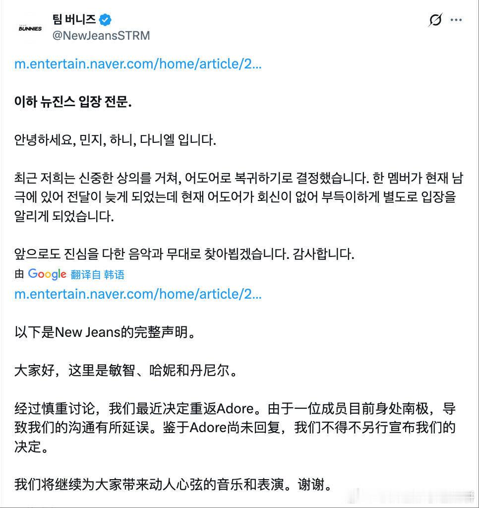 newjeans现状:俩人先宣布回归ador,现在剩下三个人也宣布回归ador(原因是有个人当时在南极,没沟通好),妈啊一共就五个人,还要分几拨回去…以及ador正在确认她们回归的真实性(就是她们在公司还不知道的情况下,自己宣布自己回归ador?)