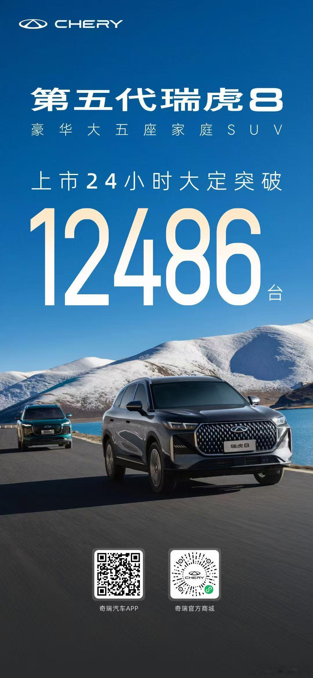日前, 称,第五代瑞虎8上市24小时大定突破12486台。新车使用双外观以及双内饰的设计风格,根据配置共推出4款车型,新车指导售价9.99-12.99万元,限时售价9.29-12.29万元。
