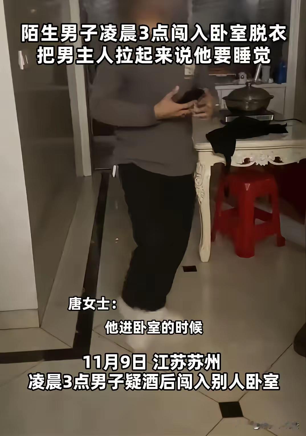 苏州,男子凌晨3点闯入女子家,脱掉衣服裤子,还让女子老公让开,他要睡觉。女子老公直接把对方按在地上,女子也跳下床直接报警,最后,该男子也被带走。女子表示,楼下的大门没有反锁,自己的卧室门也没有反锁,可能才是导致男子酒后误入她家的原因。 网友评论: 看过这样的小品,警察跟着醉汉回家,还真的打开了门,指着床睡觉的两个人对警察说,床上的女人是我媳妇,旁边那个男人就是我。这不都是没锁好门闹的么? 像这种情况,本人认为应该适当处理,那男子喝醉了酒误入别人的房间,本质上没有对他人造成大的危害,也没动武,应该赔一点精神损失费,对于刑事责任就不要追究了。 人家是喝醉了酒,本质没有恶意!!应该从轻处罚!!罚一点钱可以了,没必要搞到别人坐牢。 粗心大意忘关门,其中奥妙难析闻,酒醉心明兴大胆,不是熟悉不会呈。事藏心里难洞明,酌情谅解无祸升。 同事十几年前住在学校,深夜喝醉了,不但自己从大铁门上翻进去,还把自行车也扛了进去,第二天醒来不知道怎么翻进去的!
