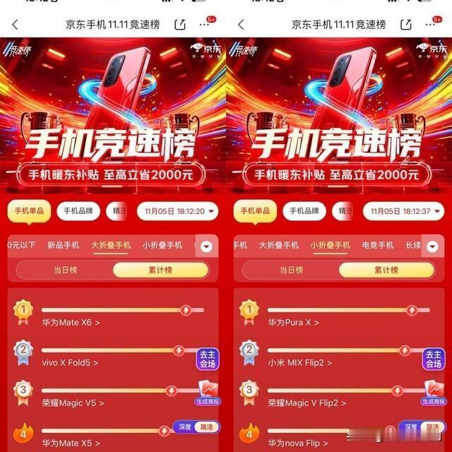 双十一折叠屏迎换新热潮,华为折叠屏家族产品均成为行业销冠! 根据“京东手机11.11竞速榜”数据显示,华为折叠屏家族在双十一期间销量全面爆发,成为折叠屏市场的领跑者。 这些年华为在折叠屏这赛道一直稳扎稳打,从大折叠到小巧的Pocket系列,产品线齐全。大家买这类新形态手机,最怕当“小白鼠”,选个靠谱牌子少操心,用着踏实。 折叠屏最让人担心的就是折来折去会不会坏,华为在这块做得确实到位,铰链扎实,屏幕折痕也控制得越来越好。而且现在价格也下来了,双十一优惠完,五六千就能入手个小折叠,挺香。 看着身边越来越多人用上折叠屏,感觉这玩意儿真的要普及了。要是你正考虑换手机,会试试折叠屏吗?