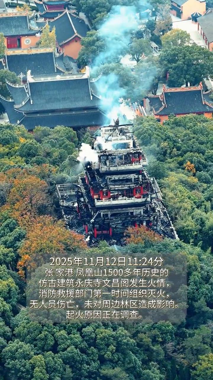 2025年11月12日11:24分,张家港凤凰山1500多年历史的仿古建筑永庆寺文昌阁发生火情,消防救援部门第一时间组织灭火,无人员伤亡,未对周边林区造成影响。起火原因正在调查。