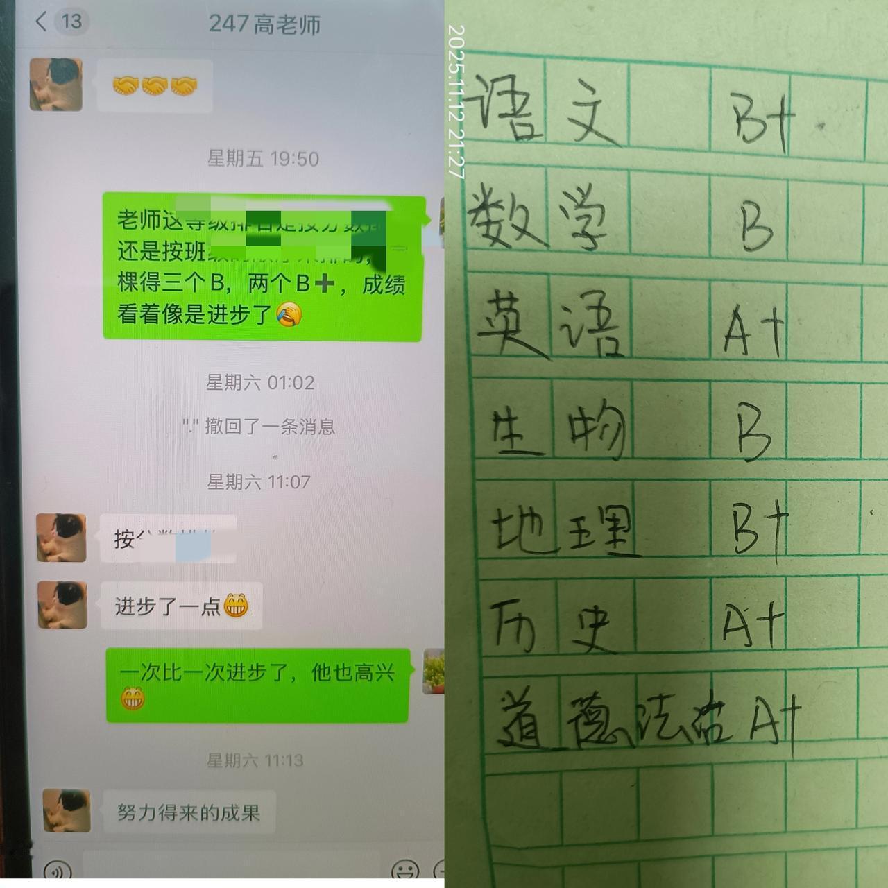 惊!感觉我家“学渣”儿子要开窍了! 哎呀妈呀!今天才想起还有三科成绩没查看,所以看到成绩单时我差点把手机扔了——3A+,4B!这真是我家那从小稳坐班级“倒数宝座”的小子考的? 小学六年,他的成绩单就没让我省心过,红叉比眉毛还密。初中分到“差生班”,我都做好了陪他“混”三年的准备。结果班主任的积分制度太神了,上课发言、写作业都能加分,我家小子竟周周拿表扬,老师还特意叮嘱我在家多夸他。 虽然在学校表现很好,但是在家还是老样子,就不见有作业写过,也不知道这成绩是运气好,还是题型简单,反正确认成绩是真的后,我激动得差点给老师送锦旗。只求这开窍不是昙花一现,我家“学渣”能一路逆袭到底! (因为今年查成绩的小程序又换了,没有集中一个页面,所以我一科一科的去抄了下来,之前还没认真确认就找老师去了,心里激动了点哈!这个虽然主科还是不够好,但是真的进步了,别喷哦!) 学渣 初中儿子