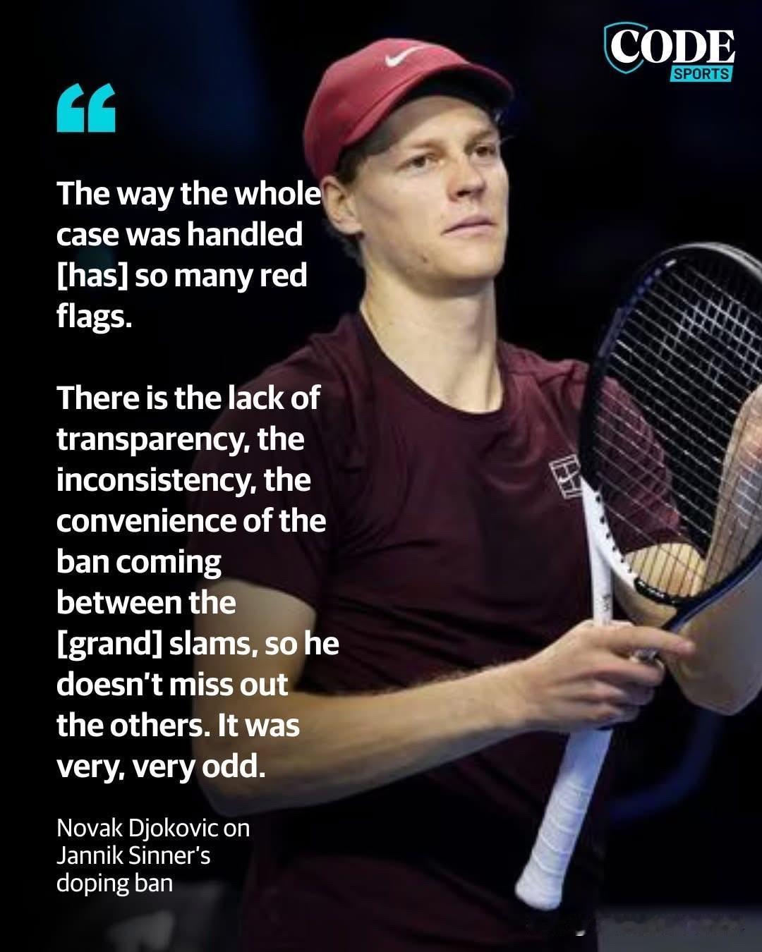 德约科维奇近日再次公开谈到了辛纳兴奋剂禁赛事件:“整个案件的处理方式疑点重重,缺乏透明度,而且前后矛盾,禁赛安排在大满贯赛事之间,这样以来可以使他不会错过重大的比赛,这非常非常奇怪。” 很明显直到现在德约科维奇依旧不满辛纳兴奋剂事件的处理方式,此番言论一出,他也遭到不少球迷的反驳,甚至说他五十步笑百步,故意利用医疗暂停来扭转比赛局势,这又该怎么解释?大家对德约科维奇的言论有何看法呢?