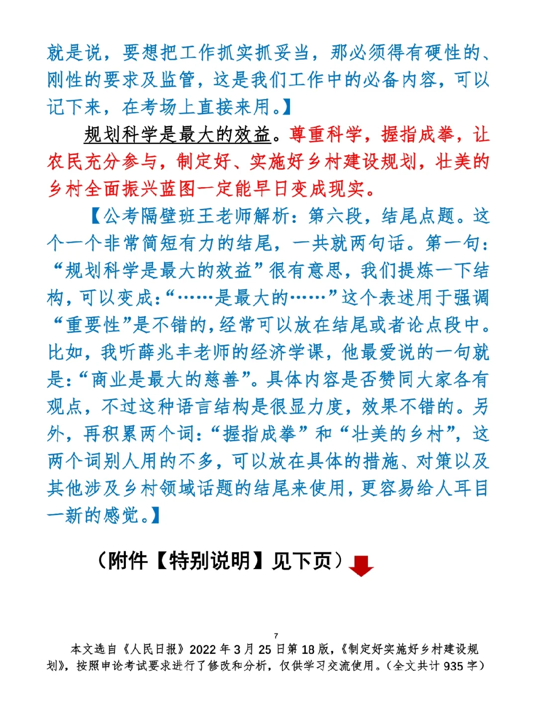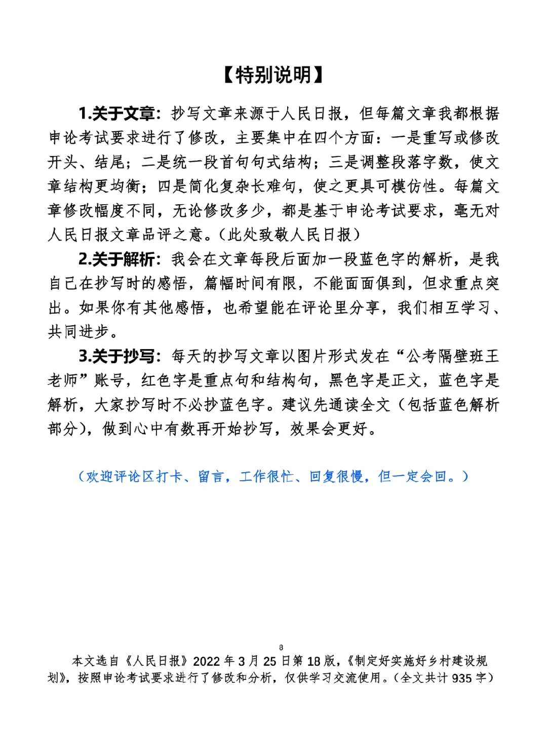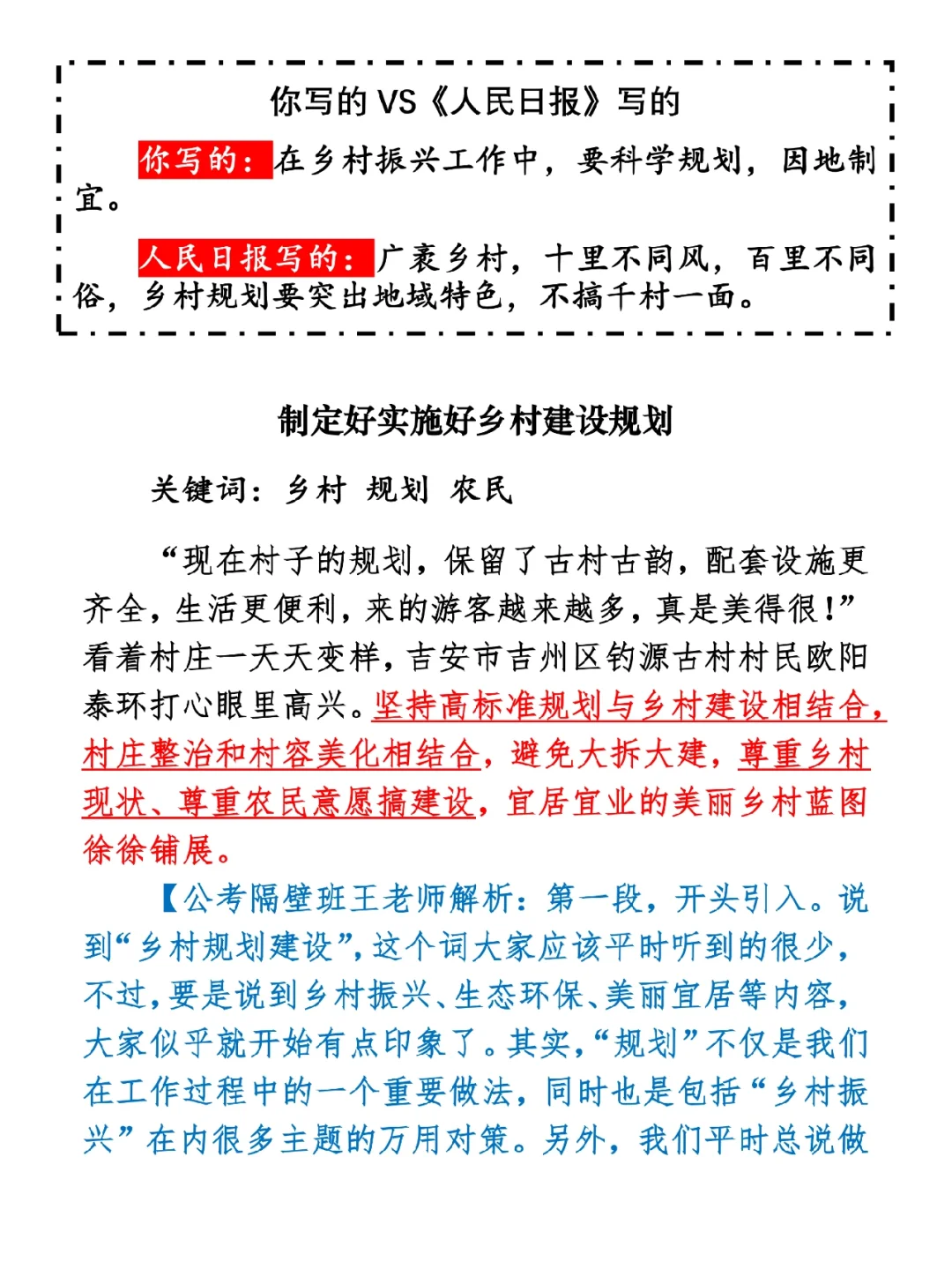 有同学在评论里留言说,怎么这么多老师都押乡村振兴,还有完没完?! 明确回答:没完。 第一,乡村振兴还能考很多年,不是押题,是全国上下的工作重点。 第二,乡村振兴早就不是考点了,真正的考点是乡村治理、农业4.0、数字乡村、乡村文化……还有比如今天这篇“乡村建设规划”。 看懂了吗,考点早就细化了,背两段乡村振兴的政策原文早就不够用了。 ⭐️ ⭐️ ⭐️ ⭐️ ⭐️ ⭐️ 这里是公考隔壁班王老师独创的“每天半小时 申论80分”抄写团,欢迎加入我们!