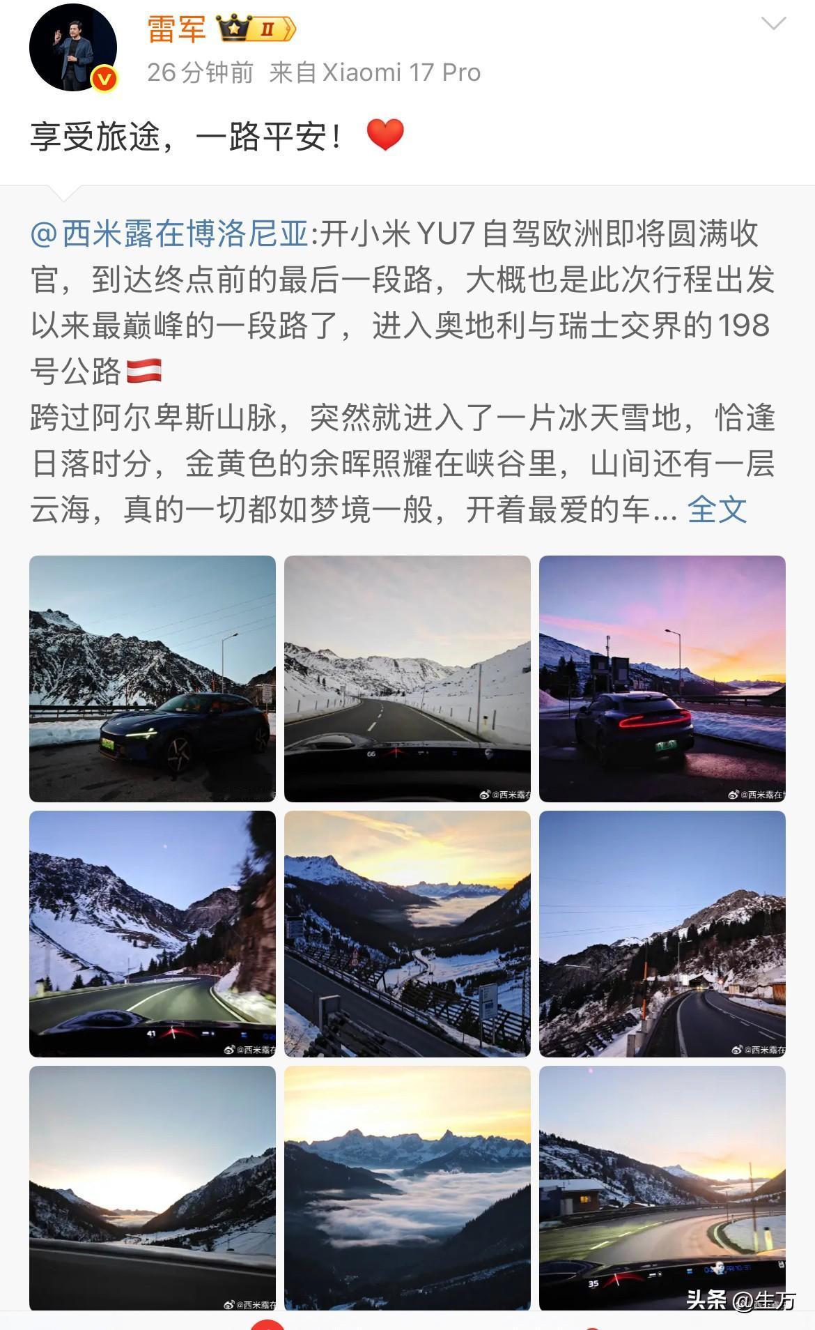 雷军给开小米YU7自驾欧洲的博主送祝福! 这位博主可不简单,他开着小米的SUV在欧洲开了一大圈,这次他到达的地方根据定位来看,是在奥地利的火车站! 一路上他边走边拍,很巧的是雷军也看到了这些照片,这好像是他刚刚跨越阿尔卑斯山的照片,该说不说,阳光洒下来的时候这种景致也确实在阿尔卑斯山才能够拥有! 所以雷军让这位博主好好的享受旅程,注意安全,因为这个博主根据计划来看,他还要去意大利等等把欧洲这些国家慢慢地玩遍。 只是他没有用更多的篇幅说,这个车在这种不同的路况,以及不同的环境下 ,开起来感觉到底怎么样,毕竟像他这种开长途自驾游的,而且是很长时间的环球自驾游,与短途是两个完全不同的概念,可能他的综合感受更值得让更多的参考。