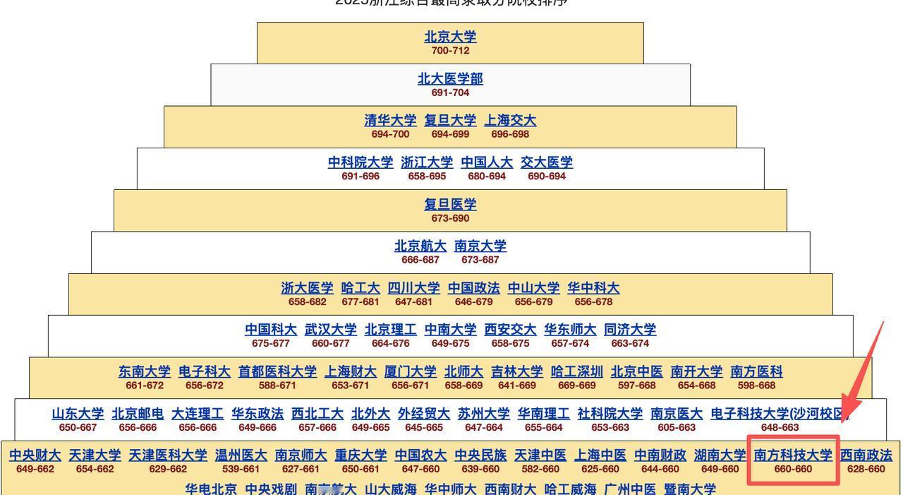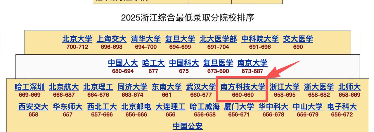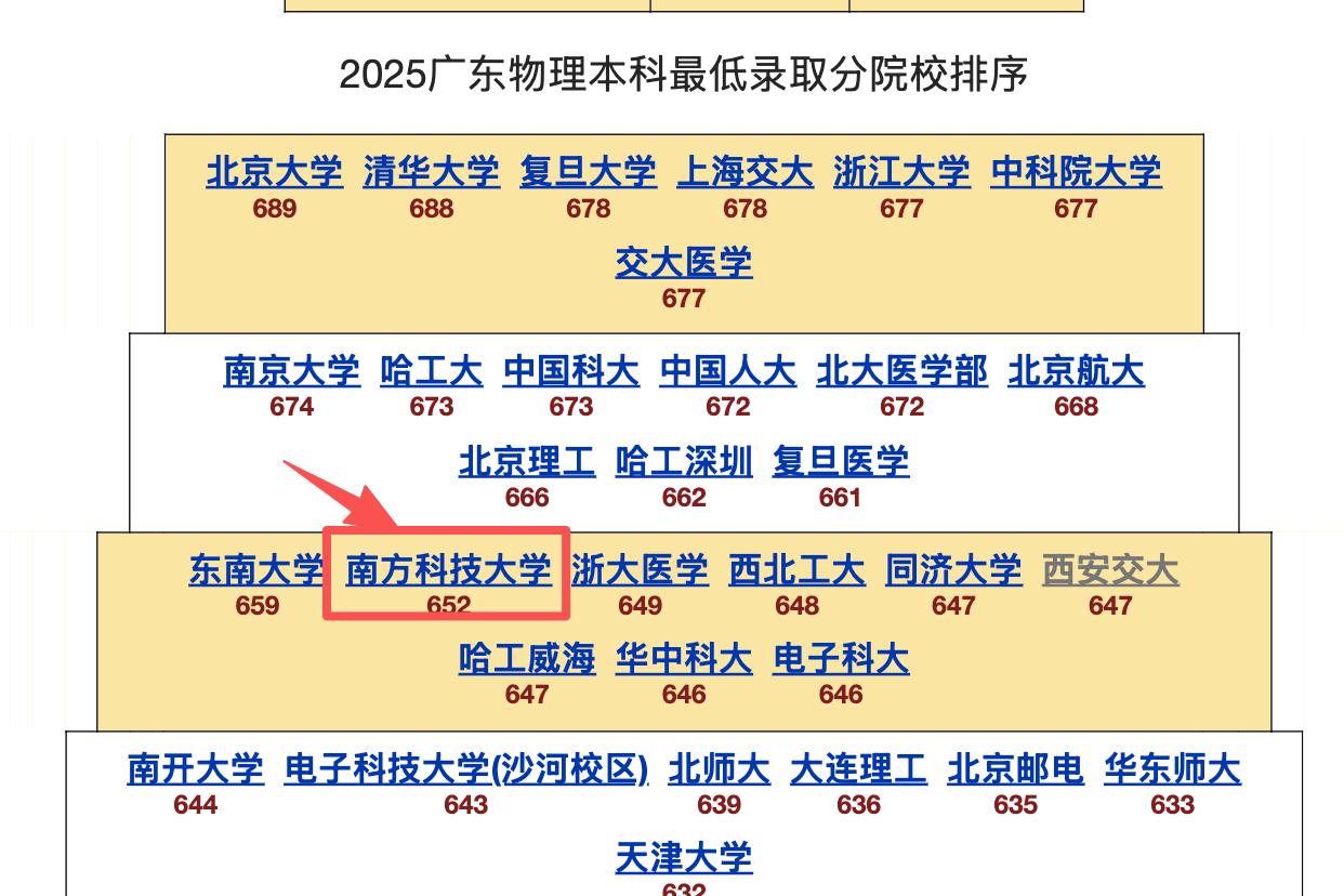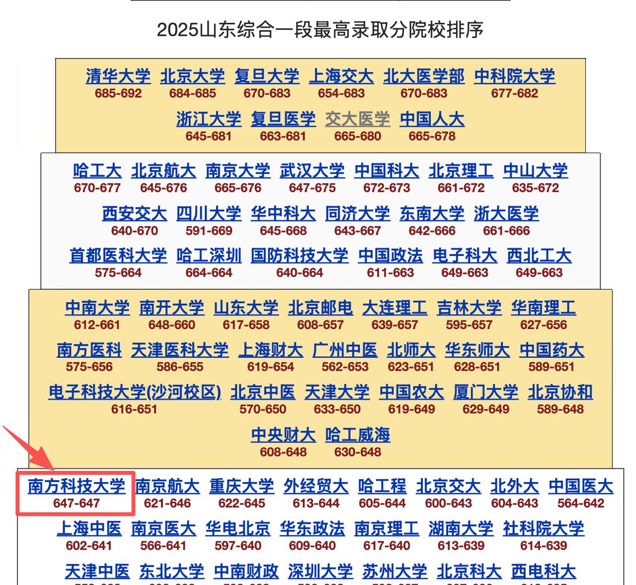 2025年,应该如何客观评价南方科技大学? ------------------------------------ 2025年6月1日,南方科技大学官宣,将在广东、山东和浙江三省,率先增设普通本科批次录取。 这种录取方式,暴露了南科大的野心:在普通本科比,拿下985,进军顶级大学行列。如果这一目标能实现,则南科大的成长目标,又更上一层楼了。 普通本科批录取,与综合评价不同,是高手之间的直接对攻,谁胜谁负,只看结果,不论出处,正如今年的福耀科技大学,把一众985踩在脚下,有人虽不服气,但人家就是赢了!胜出才是王道! 老百姓选择大学,特别是顶流大学,看得就是分数。 清北之所以一直牛,是因为人家是千年的老大和老二,长期排在榜首的位置! 所以,谁能在录取分数线的潮头,谁就是老大。 按这个评价逻辑,我们看看,南科大今年在广东、山东和浙江三省的投档线。 一、南科大真实实力评估 1、山东省2025年最低投档线排序 在山东,南科大最低录取分排在第20名,与武汉大学并列。 2、广东省2025年最低投档线排序 在广东,南科大最低录取分排在第18位次。 3、浙江省2025年最低投档线排序 南科大660分,与武汉大学并列,处于19位。 所以,从数据来看,南科大基本在全国普通批次中,处于18-20位的层次。 这个位次相当高了。 二、勋哥观点 1、南科大的分数,有专业的因素在里面,这点大家要认清。 比如南科大在浙江,只招一个人工智能专业,这个专业既叫好,又叫座,而一众985大学相比之下,拖儿带女,带着一堆不受待见的专业,所以分数比不过南科大,也是理所当然之事。 如果单拿每所大学的单品爆款来比,南科大的排名,可能要跌下很多。 以山东为例,如果以最高分专业排序,南科大的排名已经跌到50开外了,具体如下图所示: 647分只比南京航空航天大学的最高分专业高1分,比哈工威海还要差1分。 这或许是南科大真实的实力。 再对照一下浙江省的最高分专业排序! 南科大的分数,也只比哈工威的最高分高出1分,所以这个序列还是相对比较客观的。 2、南科大的真实实力如何? 大家不妨用上面的几张表,对照一下! 个人建议不要看最低录取分的比较,而要看最高专业分的比较,因为你有这个分数,基本上也能去一众顶流高校的好专业,这或许才是南科大的实力排序,或许才是你选报南科大综评的一个比较客观的指标!
