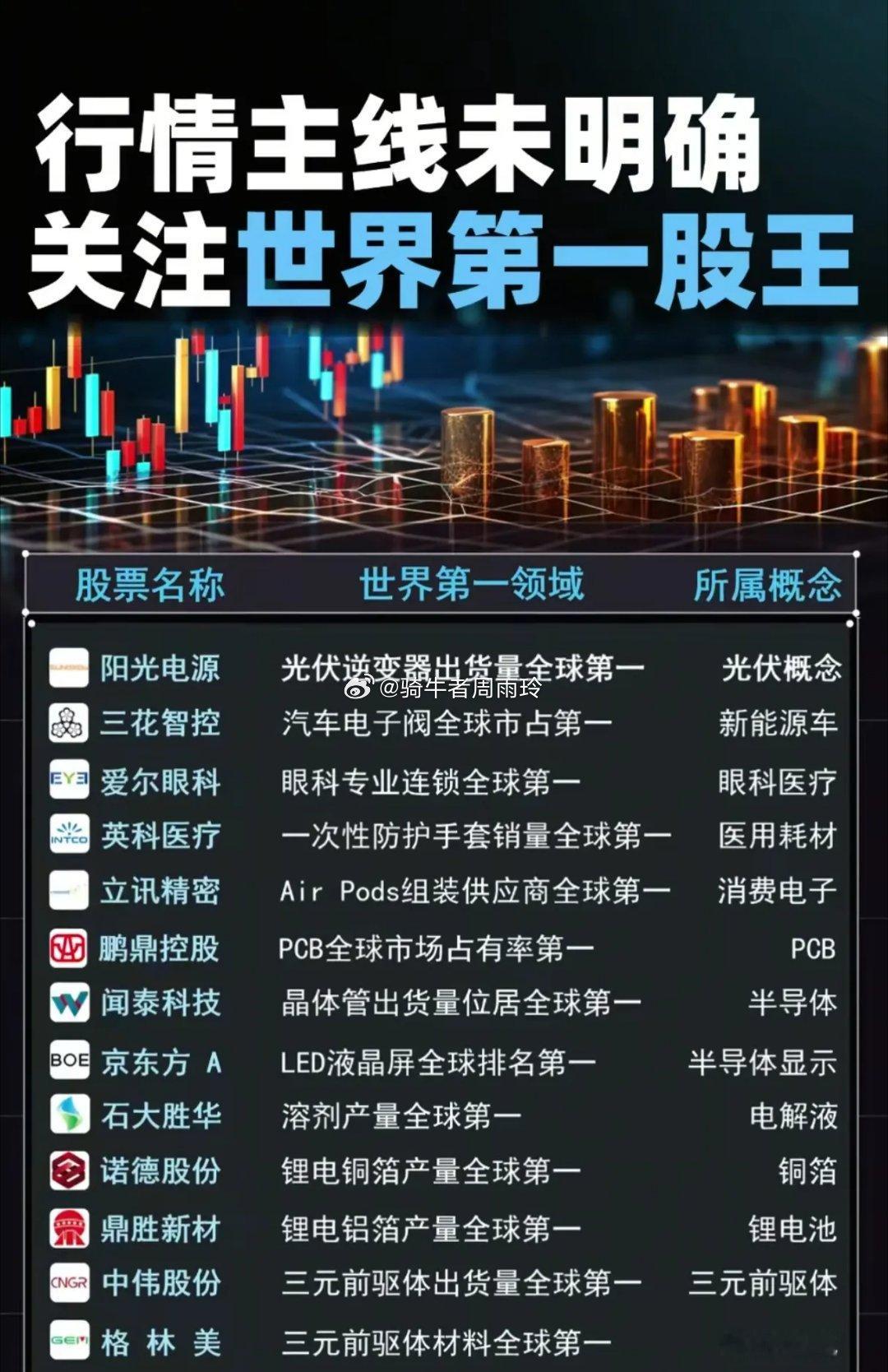 当大盘在4000点区间反复博弈、主线方向尚未锚定时,“全球冠军型资产”或成资金混沌期的锚点——这些在细分领域拿下“世界第一”的标的,凭借绝对的全球市占率壁垒,正成为震荡市中兼具确定性与稀缺性的布局方向。从光伏赛道看,阳光电源以全球第一的逆变器出货量坐稳“卖铲人”头把交椅,隆基绿能、通威股份则分别在组件、太阳能电池领域垄断全球产能;新能源车产业链更堪称“冠军集中营”:宁德时代动力电池装机量碾压式领先,三花智控的汽车电子阀、恩捷股份的锂电隔膜均以绝对市占率锁死细分话语权。更值得关注的是“隐形冠军”的跨界破圈:爱尔眼科以全球最大眼科连锁网络构建医疗服务壁垒,立讯精密凭AirPods组装的绝对优势切入消费电子核心供应链,甚至涪陵榨菜、贵州茅台也在传统领域拿下全球市值/产销的“单项冠军”。这些标的的共性在于:以“全球第一”的硬实力穿越行业周期,既规避了单一赛道的波动风险,又凭借细分垄断地位掌握定价权。在主线模糊的震荡市中,“世界冠军”们的“隐形护城河”,或许正是当前市场最扎实的alpha来源。