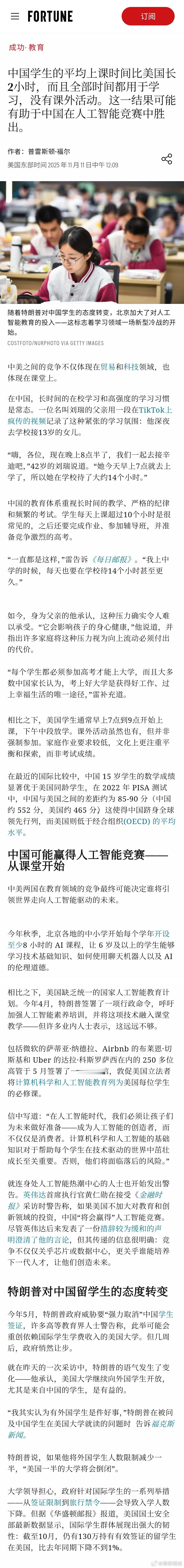【中国学生的平均上课时间比美国长2小时,而且全部时间都用于学习,没有课外活动,有助于中国在人工智能竞赛中胜出。】[美国输在了“快乐教育”的起跑线上?]