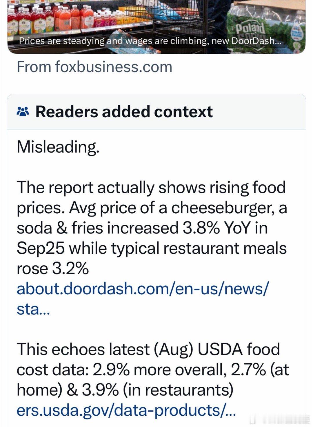 Fox 引用外卖平台数据,称“物价平稳”白宫发言人转发Fox的报道被标注“不实”:外卖数据明明显示,汉堡+薯条+饮料套餐,涨价3.8%,饭馆一餐平均涨价3.2%这与农业部数据相符:食物总体涨2.9%,其中在家做饭涨2.7%、在饭馆吃涨3.9%总统和白宫,在各种场合一直强调:美国没通胀、物价在降低…其他事很容易误导,物价不行,每天真正消费的人,都知道实际情况