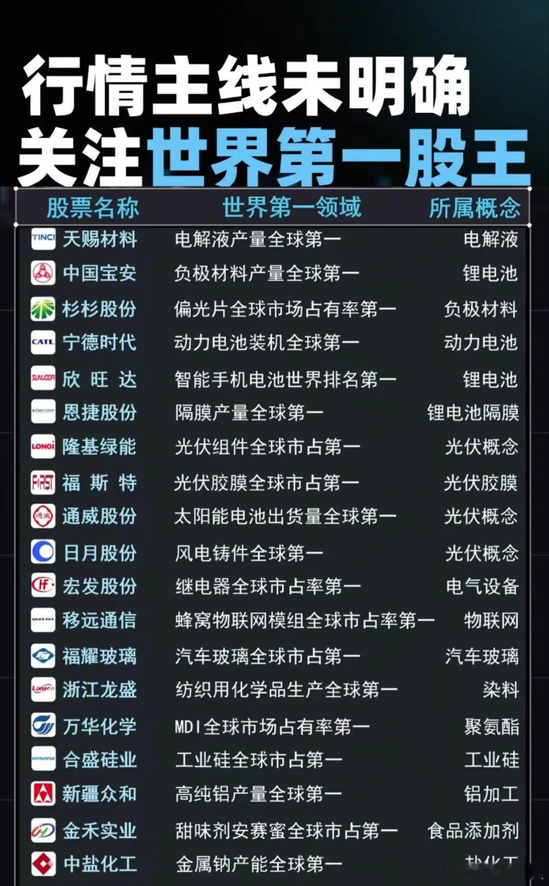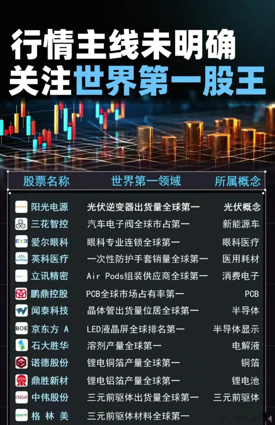 当大盘在4000点区间反复博弈、主线方向尚未锚定时,“全球冠军型资产”或成资金混沌期的锚点——这些在细分领域拿下“世界第一”的标的,凭借绝对的全球市占率壁垒,正成为震荡市中兼具确定性与稀缺性的布局方向。从光伏赛道看,阳光电源以全球第一的逆变器出货量坐稳“卖铲人”头把交椅,隆基绿能、通威股份则分别在组件、太阳能电池领域垄断全球产能;新能源车产业链更堪称“冠军集中营”:宁德时代动力电池装机量碾压式领先,三花智控的汽车电子阀、恩捷股份的锂电隔膜均以绝对市占率锁死细分话语权。更值得关注的是“隐形冠军”的跨界破圈:爱尔眼科以全球最大眼科连锁网络构建医疗服务壁垒,立讯精密凭AirPods组装的绝对优势切入消费电子核心供应链,甚至涪陵榨菜、贵州茅台也在传统领域拿下全球市值/产销的“单项冠军”。这些标的的共性在于:以“全球第一”的硬实力穿越行业周期,既规避了单一赛道的波动风险,又凭借细分垄断地位掌握定价权。在主线模糊的震荡市中,“世界冠军”们的“隐形护城河”,或许正是当前市场最扎实的alpha来源。
