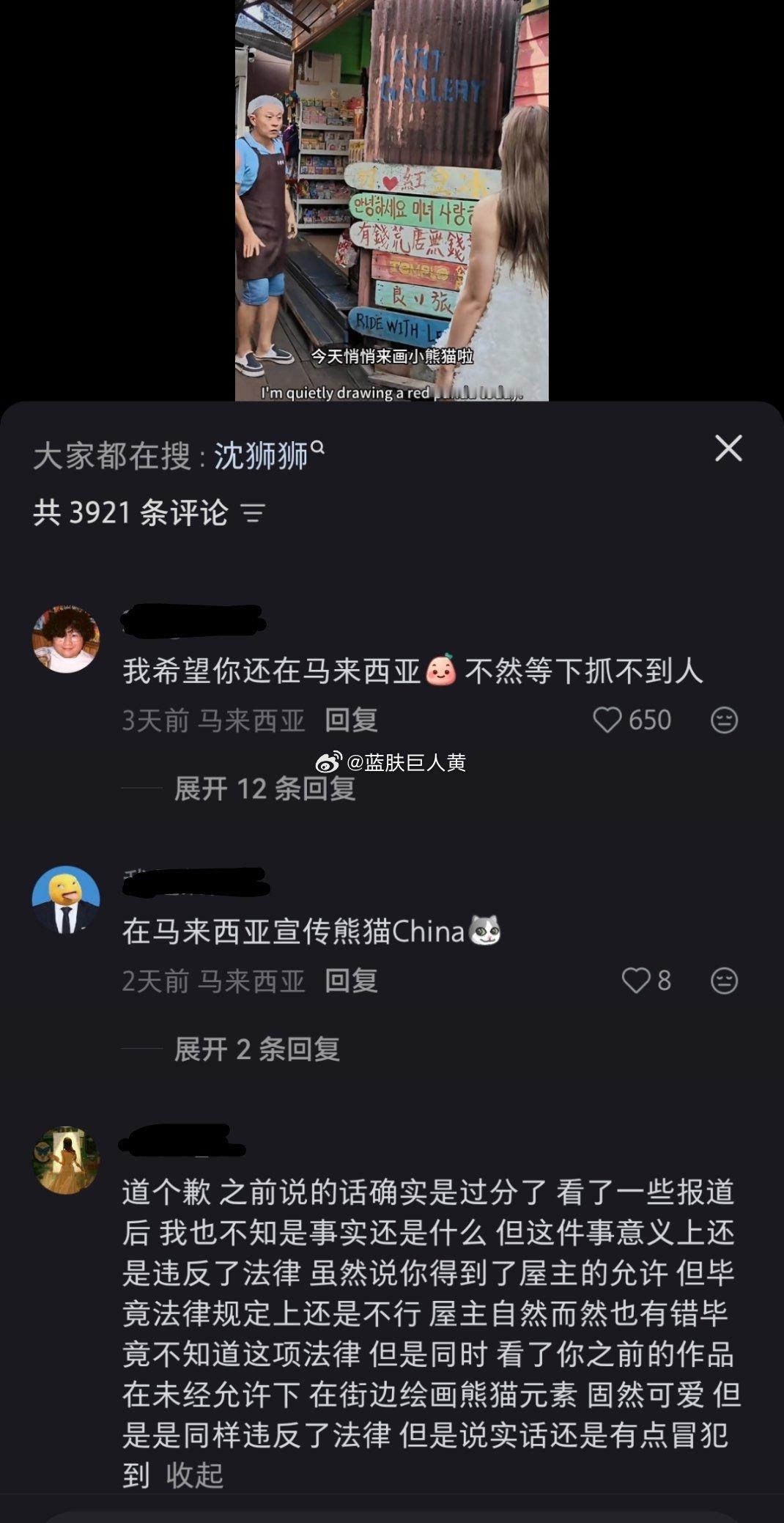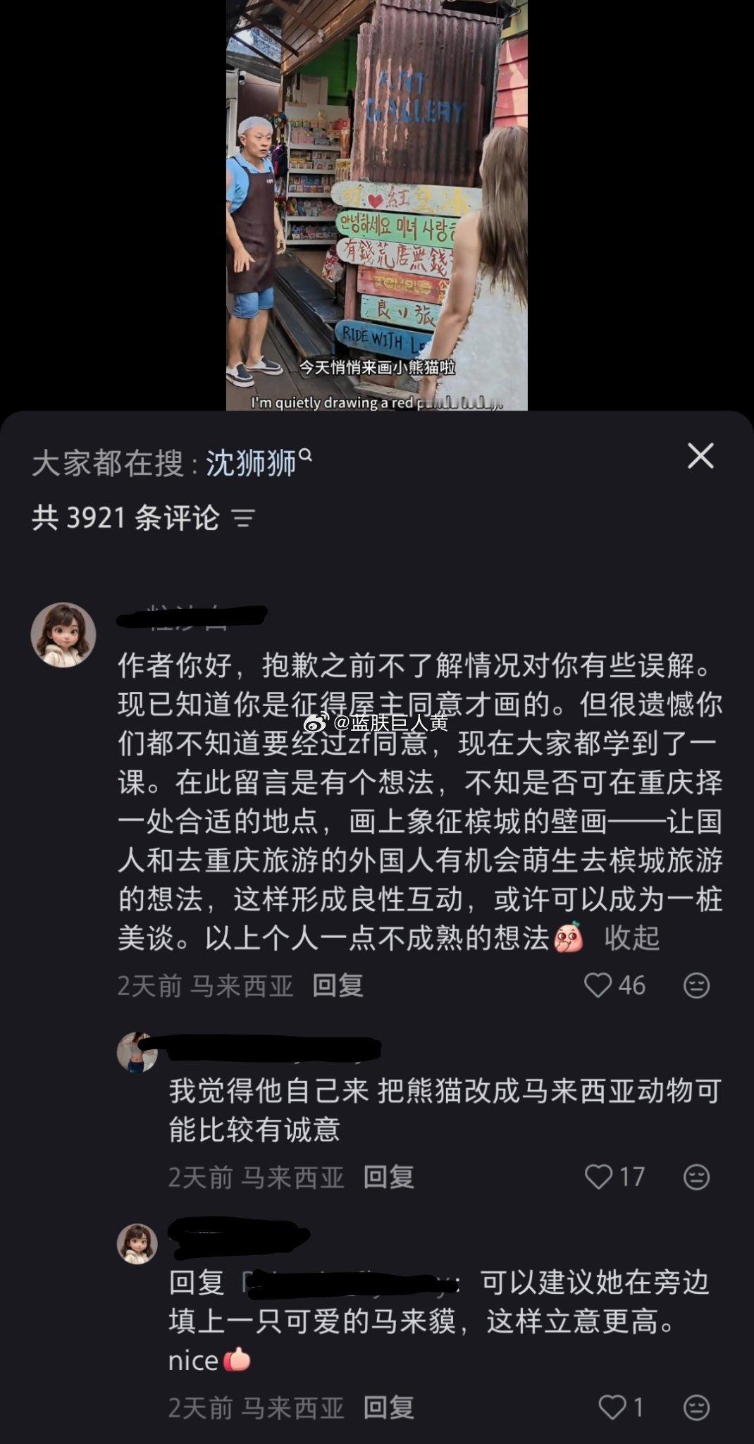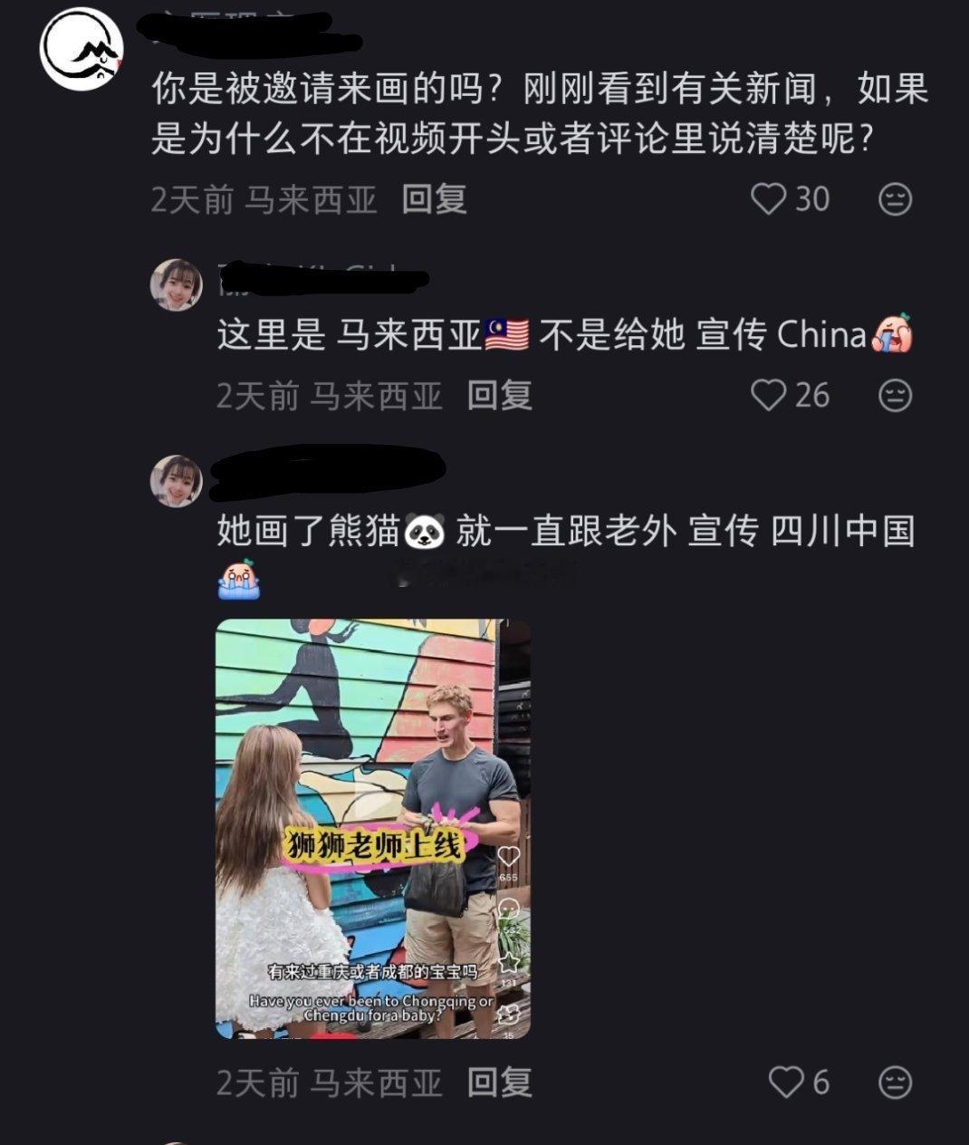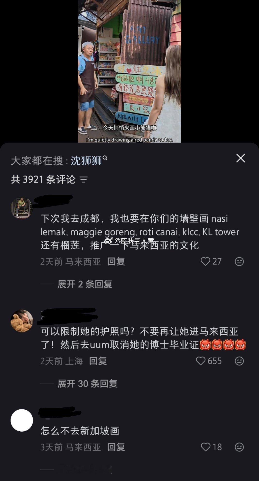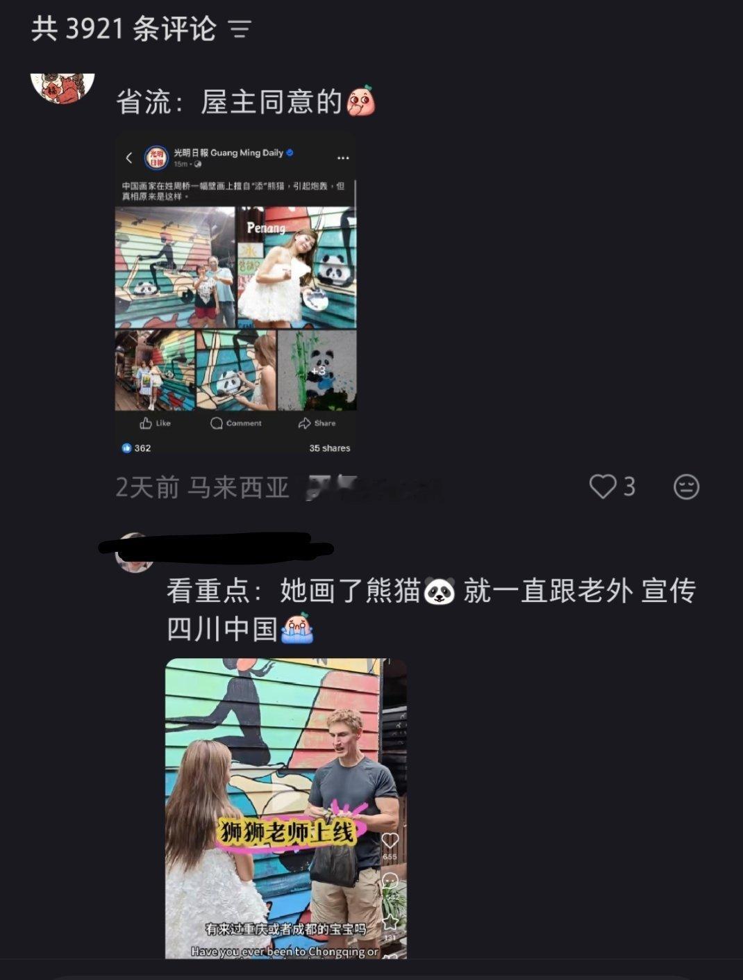 在马来西亚留学的中国女孩受槟城一艺术家邀请,在他家门口的涂鸦上加了一只熊猫。结果遭受了马来西亚网友的剧烈网暴。大马网友在已经得知中国女生是得到户主的邀请的情况下,依然不依不饶,威胁要去该女子留学的大学举报到她退学为止——