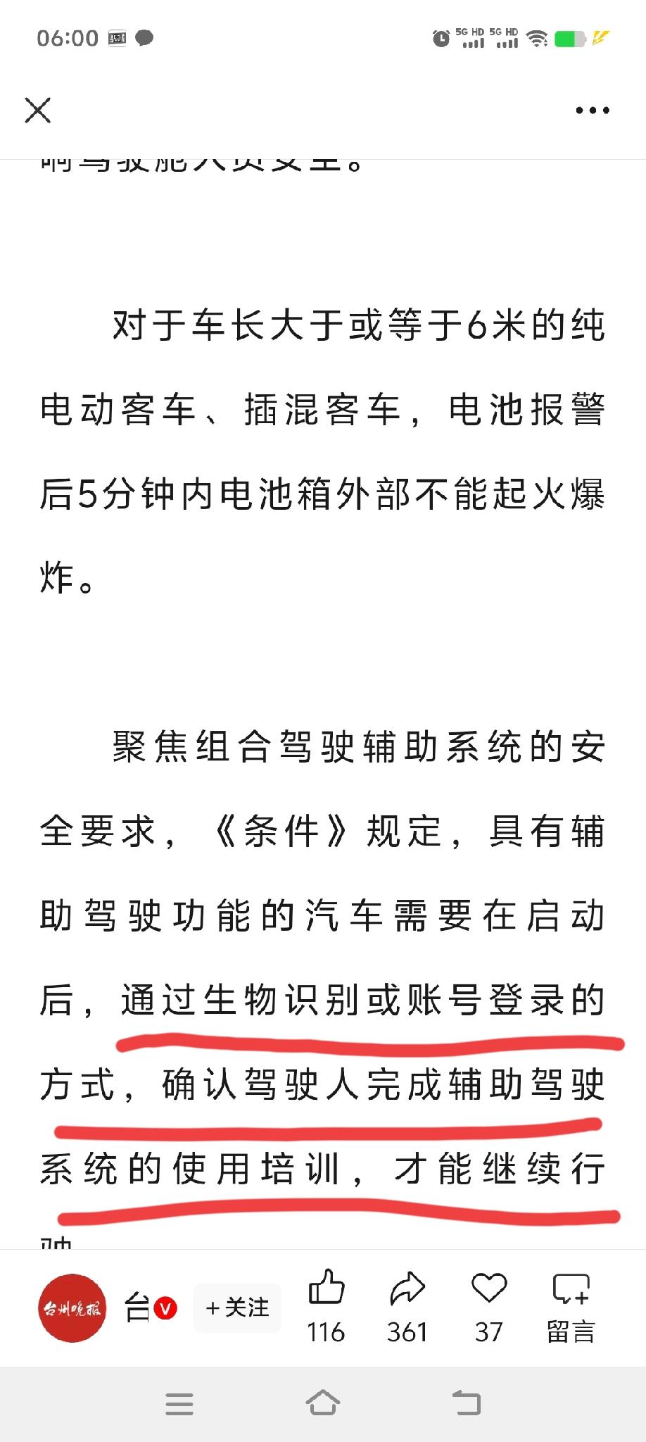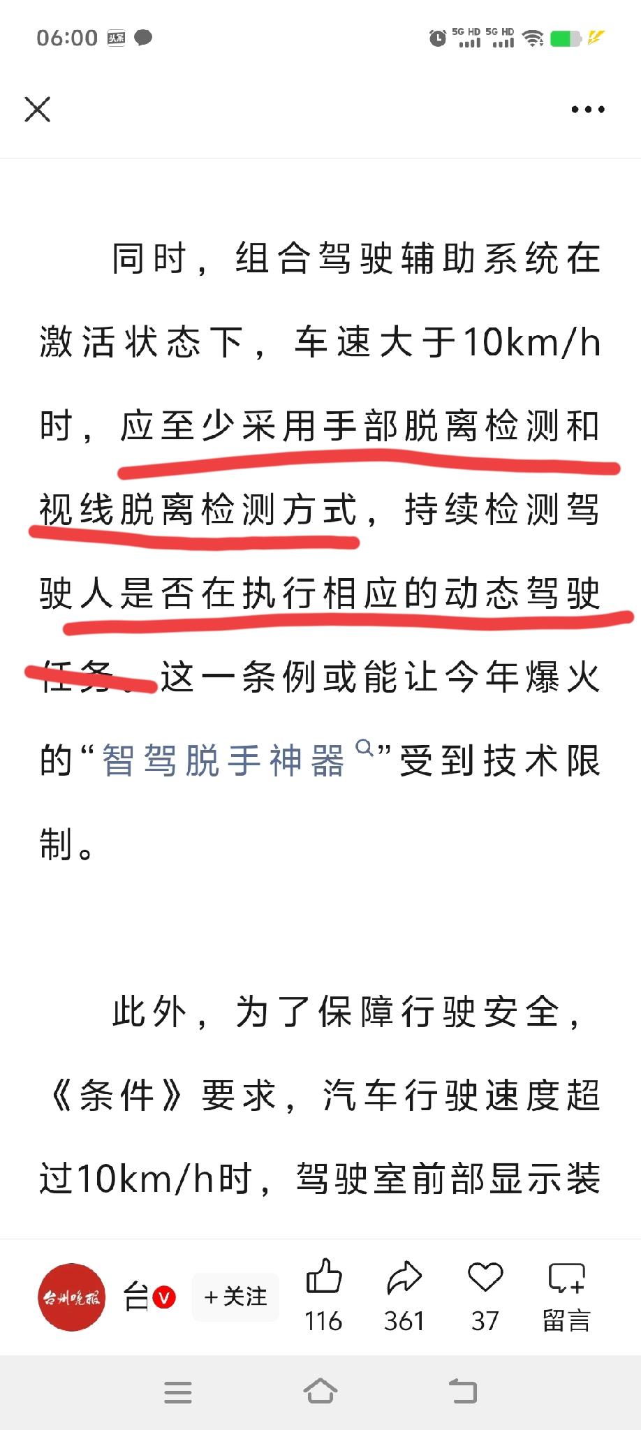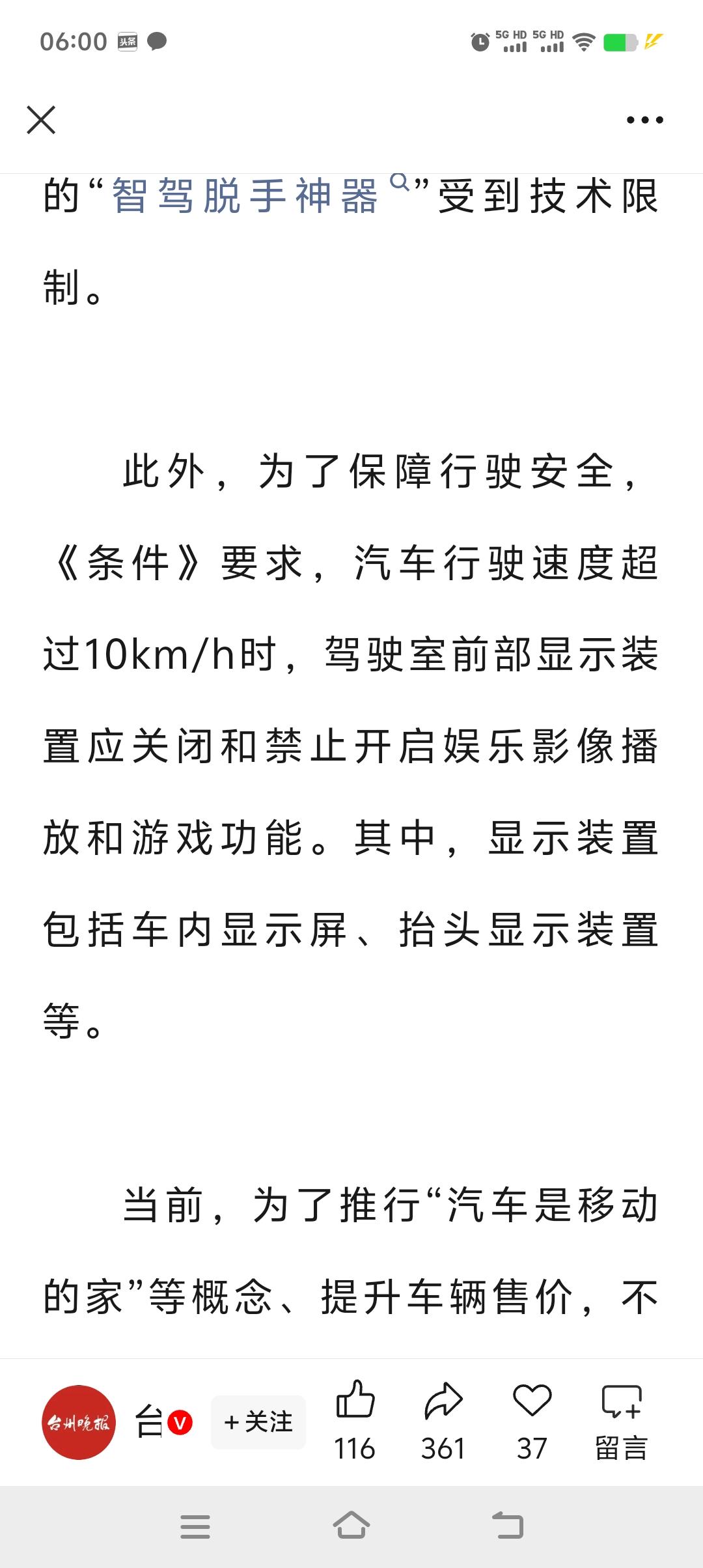 重大调整!不握方向盘还能玩游戏追剧的“智驾脱手神器”,或将彻底退出历史舞台! 近日,最新版本的《机动车运行安全技术条件》征求意见稿已经公布,全是实实在在的干货,都是为了让驾驶汽车更安全。 首先,对于电车上最火热的智能辅助驾驶系统,做出了明确的规定,简单来说就是首先要确认驾驶者身份,且熟悉基本的操作后才能启用辅助驾驶系统。 辅助驾驶模式下,你的手或视线一旦离开方向盘,或将不再进行自动驾驶。 这是一项非常重要的的改革,不仅彻底断绝了“懒汉”们方向盘都不握的轻率行为,更为其他车辆和驾驶员的安全负责,这个必须要大大的点赞。 不仅如此,只要车速大于每小时10公里,将禁止打开液晶屏的娱乐系统和游戏,将安全驾驶进行到底。 针对一部分驾驶员,误把油门当刹车的错误操作,新的标准增加了车辆在静止和蠕动的状态下,限制动力输出的安全标准,这个更是非常好的一个配置。 还有其他几项非常好的改革,你们自己看吧,个人觉得这些都是非常非常好的标准,一旦实施,交通安全环境会得到极大的改善,安全才是回家最近的路。智驾驾驶 智驾技术竞争 智驾对比 智驾辅助驾驶 汽车 @汽车天涯 @汽车之家 @懂车帝原创