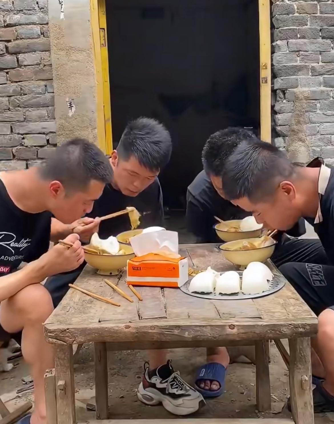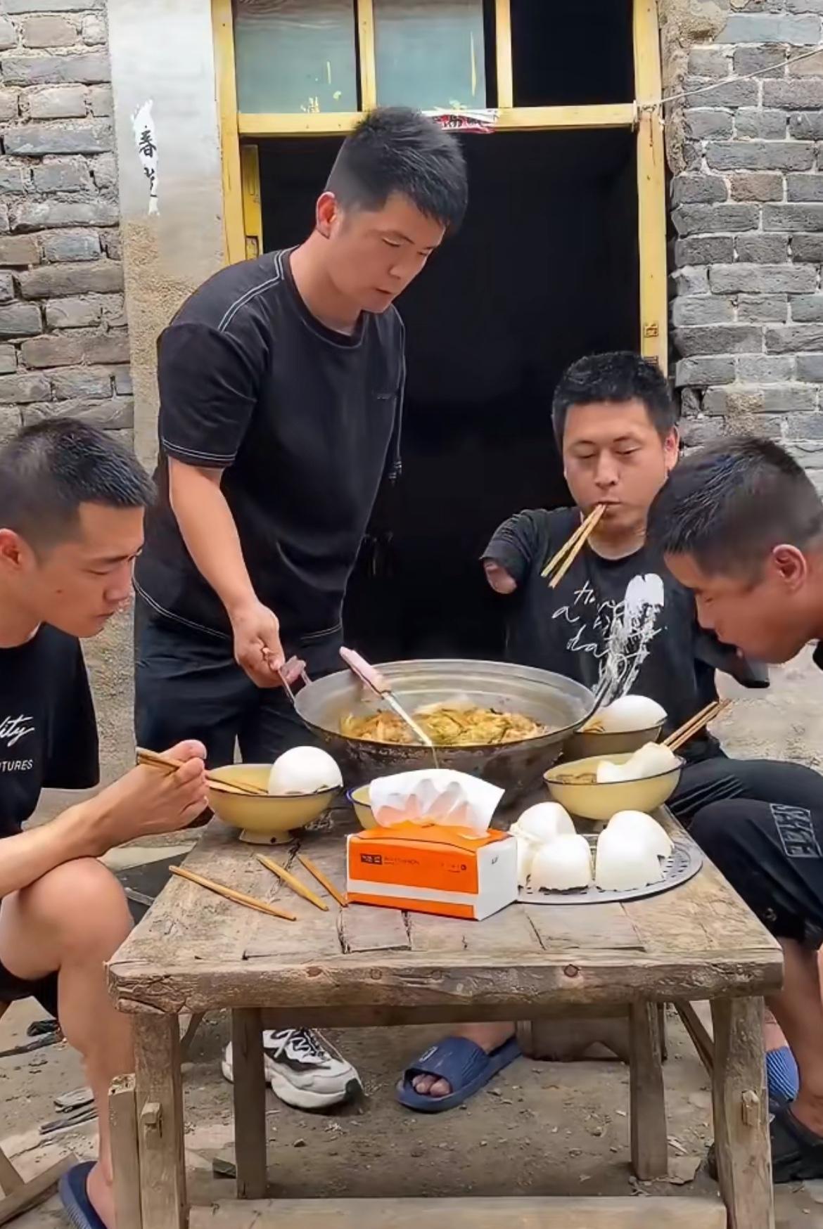 太心酸了,四个帅气小伙只有一只健康的手臂。三个人没有手臂,一个靠脚夹筷子吃饭,一个一靠臂弯夹筷子,一个用嘴衔筷子,只有一个能用手拿筷子,可是他只有一只脚,估计饭是他做的。视频虽然是摆拍,但是看到四个小伙的不幸,还是让人惋惜。