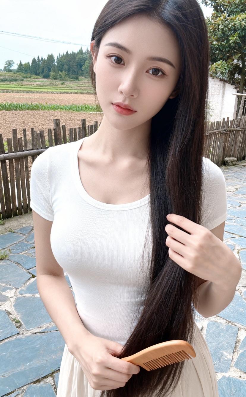 田园少女风,清新自然,长卷发,白色上衣,乡村背景,温柔可人。