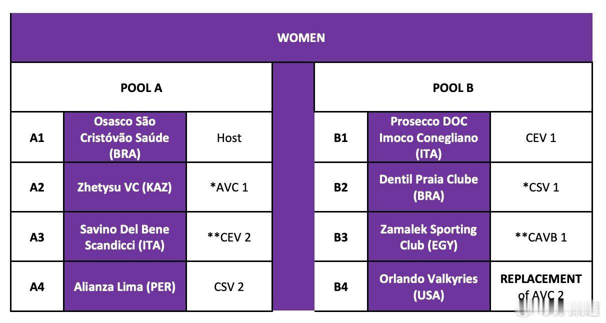 女排世俱杯最后一个名额确定!原本属于亚洲俱乐部的席位最后给了美国女排联赛PVF冠军球队奥兰多女武神队,也就是泰国二传波蓬所效力的球队。这将是美国俱乐部球队首次亮相该项赛事。具体分组形势为A组🇧🇷 奥萨斯科(巴西)🇰🇿 杰特苏(哈萨克斯坦)🇮🇹 斯坎迪奇(意大利)🇵🇪 利马(秘鲁)B组🇮🇹 科内利亚诺(意大利)🇧🇷 普拉亚海滩(巴西)🇪🇬 扎马雷克(埃及)🇺🇸奥兰多女武神(美国)赛事将于12月8日-14日在比赛在巴西圣保罗进行,