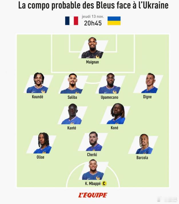 德尚在世预赛前面4场比赛使用了不同的后腰组合。科内+楚阿梅尼拉比奥+图拉姆科内+卡马文加而这一次竟然把老将坎特给招回来了,法国《队报》预测,坎特将首发,与科内搭档双后腰。他们身前的10号位是曼城的切尔基,左边锋巴科拉,右边锋奥利塞。今晚只要击败乌克兰,法国队将晋级2026世界杯决赛圈。