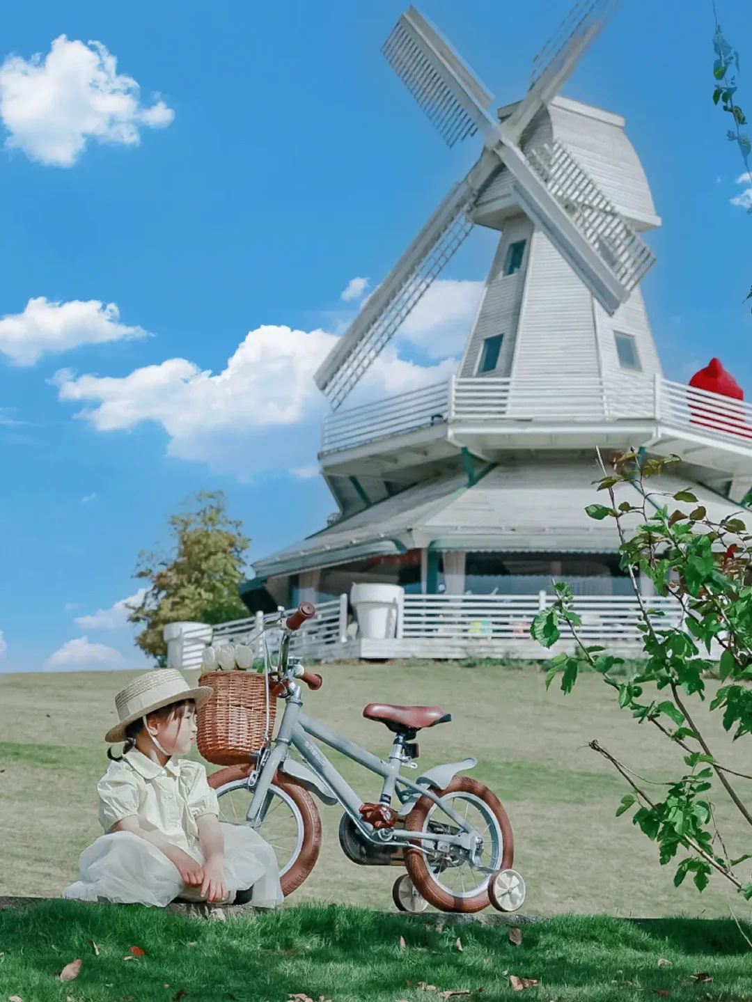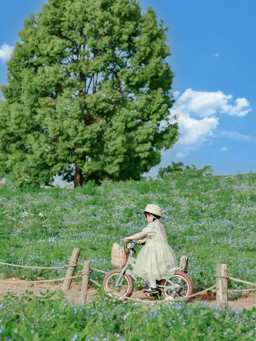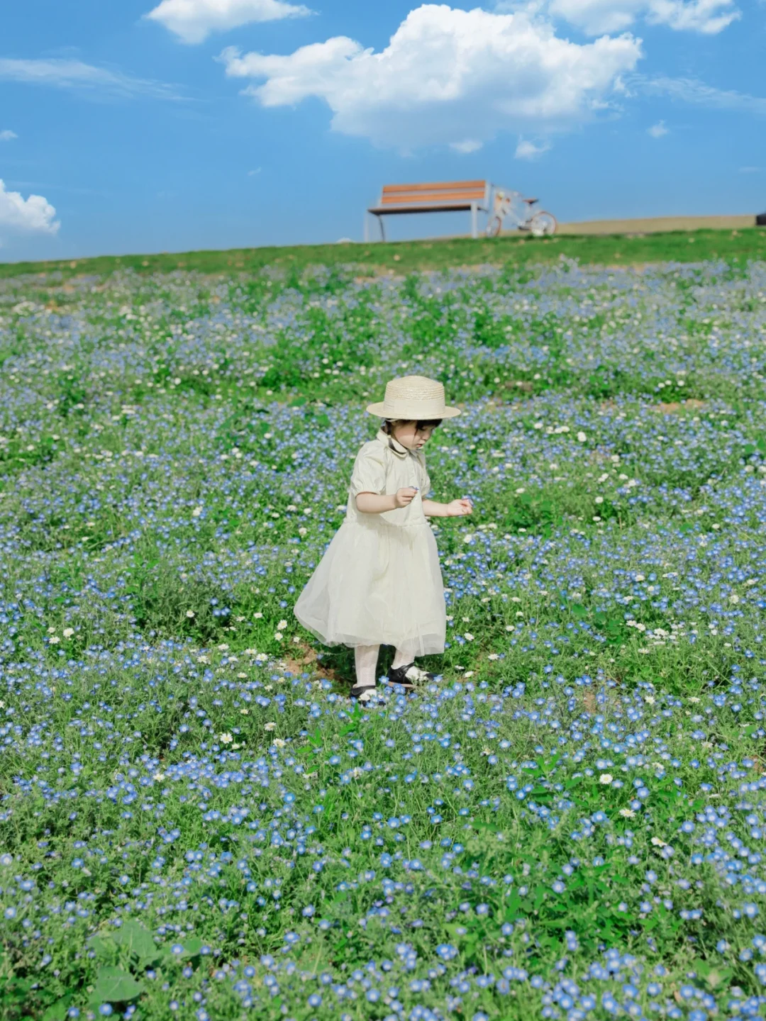 嗨,我是喜欢带娃出游的豆芽麻麻,这个距离市区不到一小时的遛娃拍照宝藏地我们已经来好多次了,这块风车下的小山坡特别神奇,它会在不同的季节开满不同的花,我已经拍过的有小雏菊,地肤草,现在又有了满山坡蓝色的喜林草花海,真的是太浪漫了,带孩子来这里骑车或者野餐真的太棒了