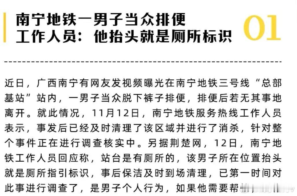 看这穿戴不像能干出这事的人啊!广西,一男子穿的人模狗样,居然在地铁公共场所当众如厕,关键是厕所就在旁边,太让人无语了 完事后他什么也没清理,转身就走了,留下一地脏东西,当时站台上还有往来的乘客,不少人吓得赶紧绕行,有家长还急忙捂住了孩子的眼睛。 更让人觉得离谱的是,男子站的地方,抬头就能看到清晰的厕所指引标识,离站台边上的卫生间只有几米。 也就是说,他稍微抬个头,多走两步就能找到厕所,根本没必要在公共场合这么做,建议对这男子罚款➕拘留