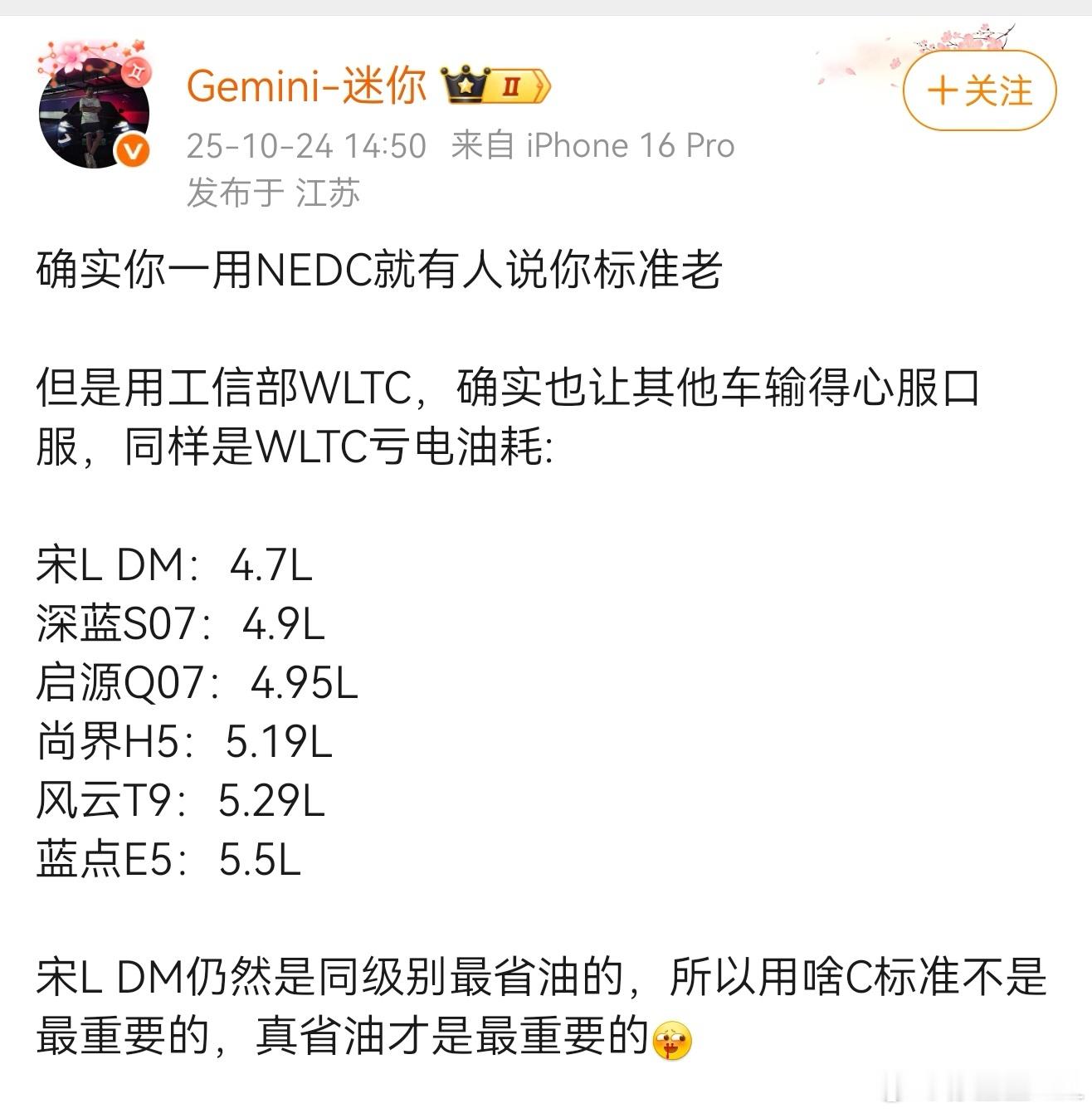 同级油耗最低的其实是银河的星舰7。WLTC亏电油耗是4.53。当然,星舰7要小一点。星舰7的长度是4740,轴距2755。宋L的长度是4780,轴距是2782。但是没有两台尺寸一样的车。比如列表里的启源Q07,长度4837,轴距2905。星舰7短了4厘米,油耗低了0.17。Q07长了5.7厘米,油耗高了0.25。是不是说明大家的技术其实都是差不多的?吉利的混动技术很好,比亚迪的混动技术也很好,长安的混动技术也不错。这0.1、0.2的油耗差距,谁都无法实现代际领先。但是如果用NEDC,是不是会给普通消费者造成大幅领先的错觉?所以。4.7的亏电油耗已经是数一数二了。干嘛还要用NEDC呢?
