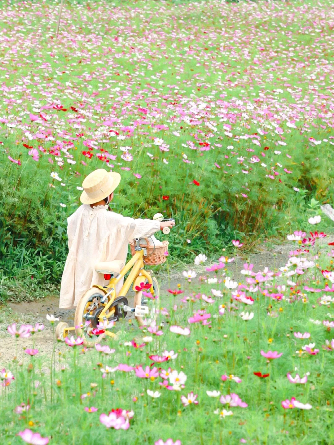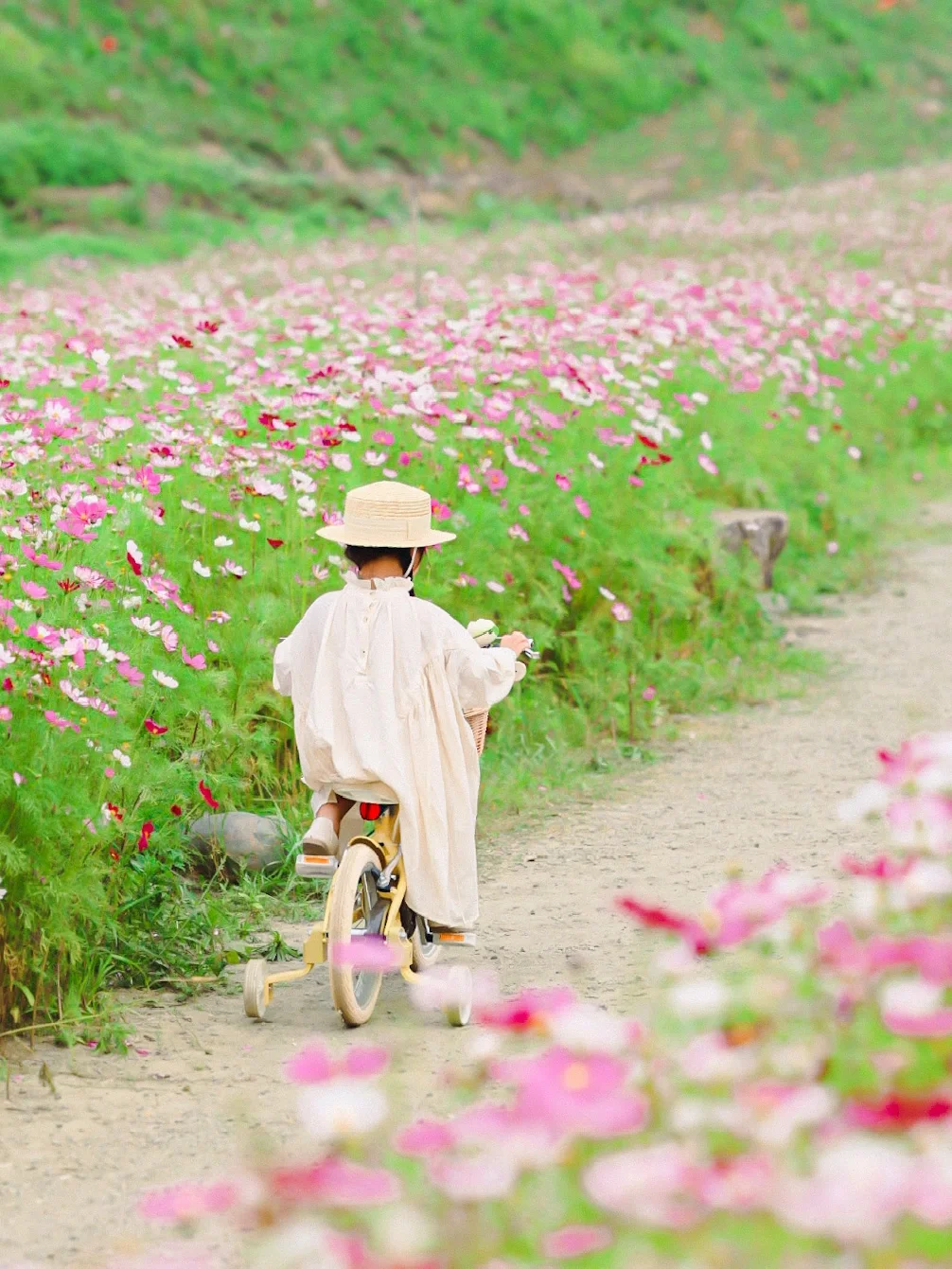 ✅花海中有许多的小路,可以走进小路里去拍,不管在小路奔跑还是骑车,抓拍出来都非常的有氛围感