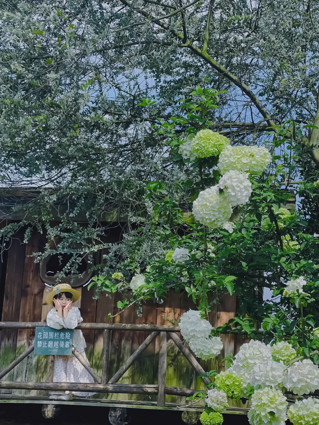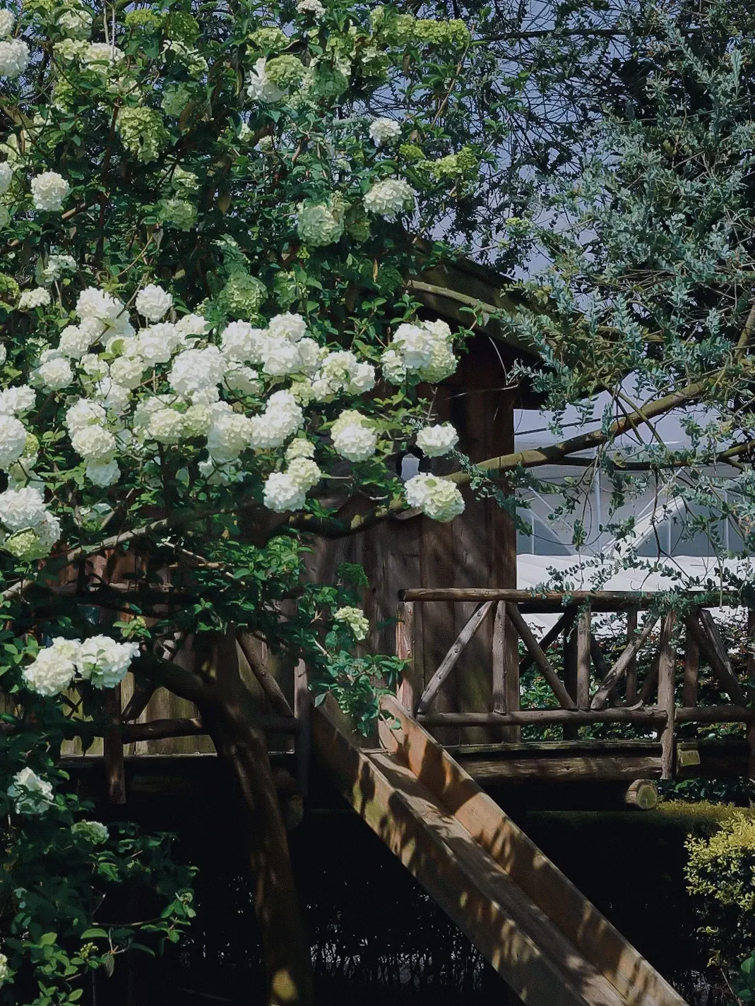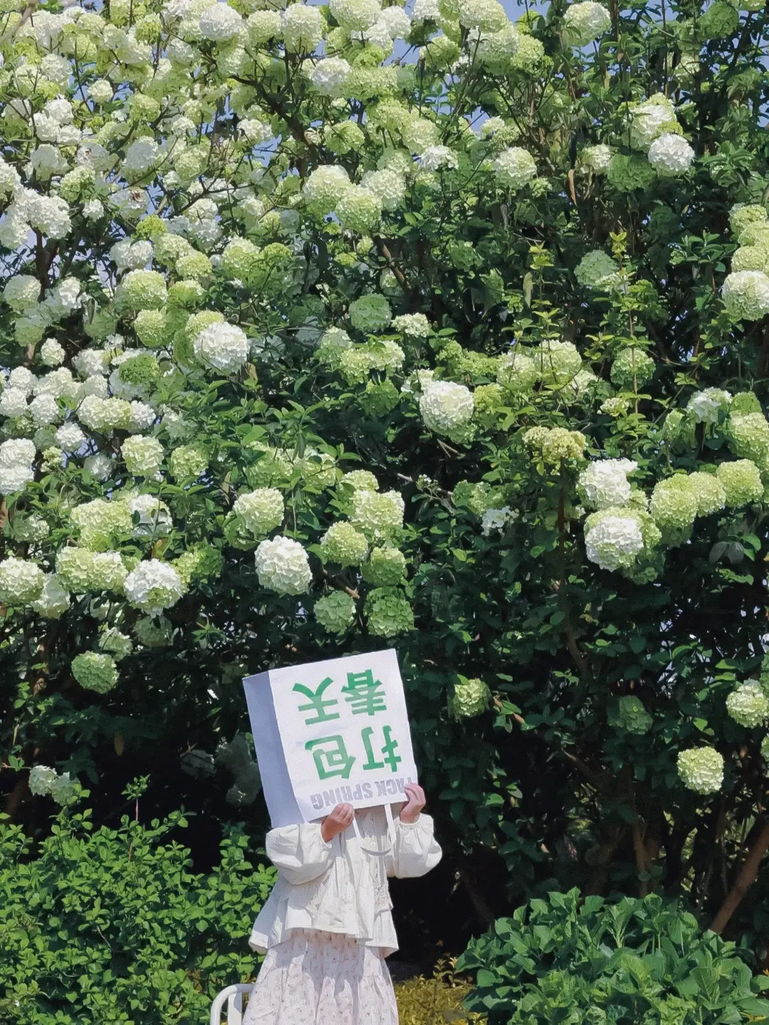 从小屋过去你就会看到一排排的木绣球现在开的正好,大朵大朵的绣球花挂满了枝头,好像在告诉我们,它拥有着一整个春天