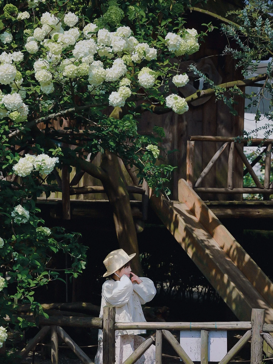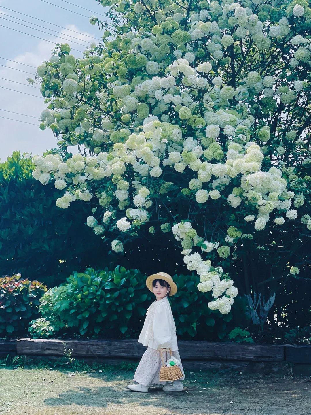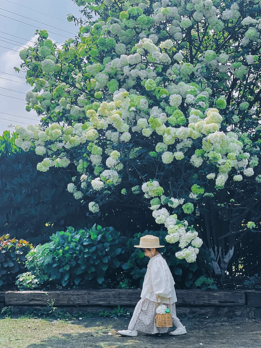 从小屋过去你就会看到一排排的木绣球现在开的正好,大朵大朵的绣球花挂满了枝头,好像在告诉我们,它拥有着一整个春天