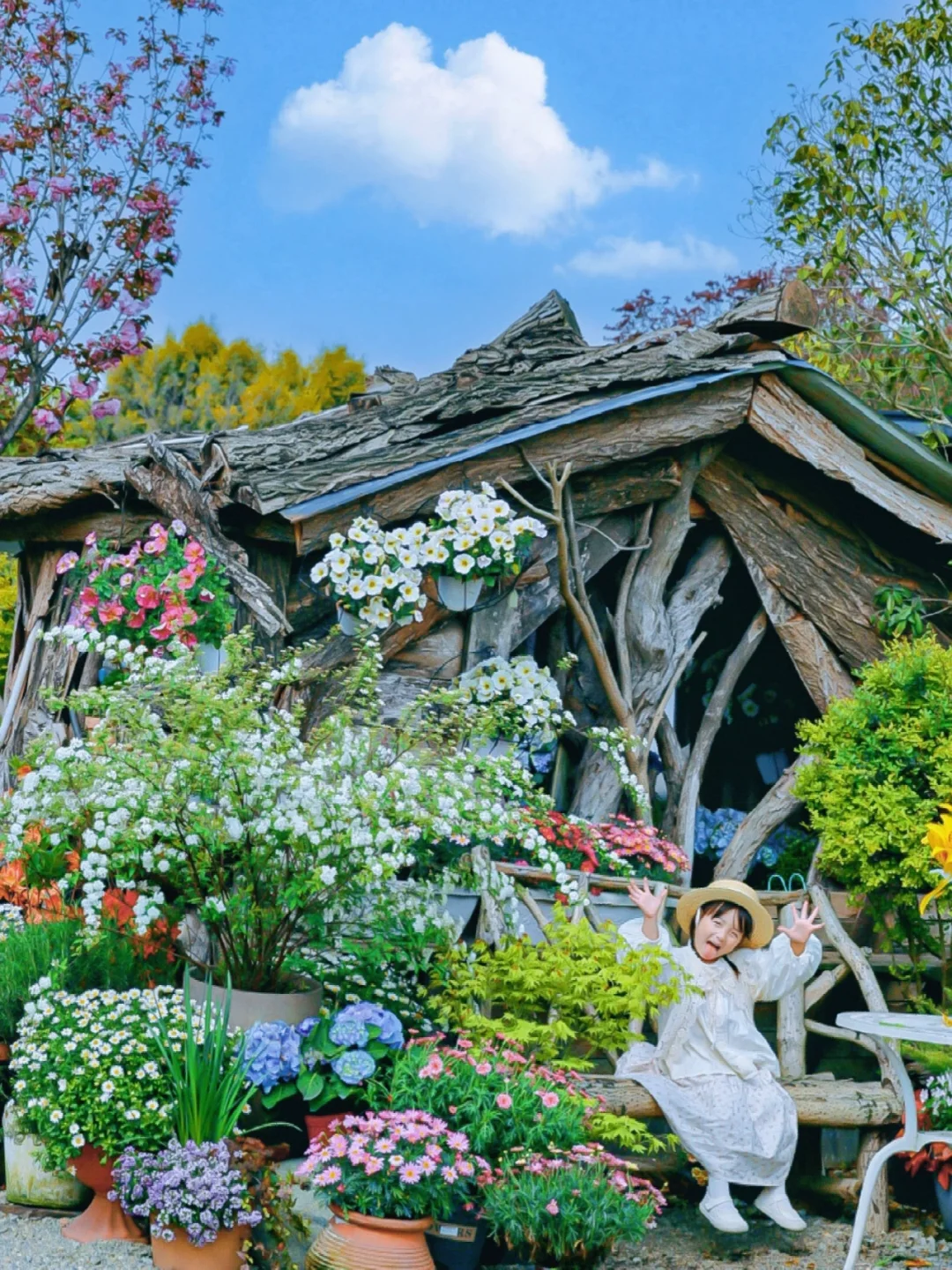 进门右手边放满鲜花的木质小屋,这一个地方就像“童话世界”里的小木屋,简直太治愈了