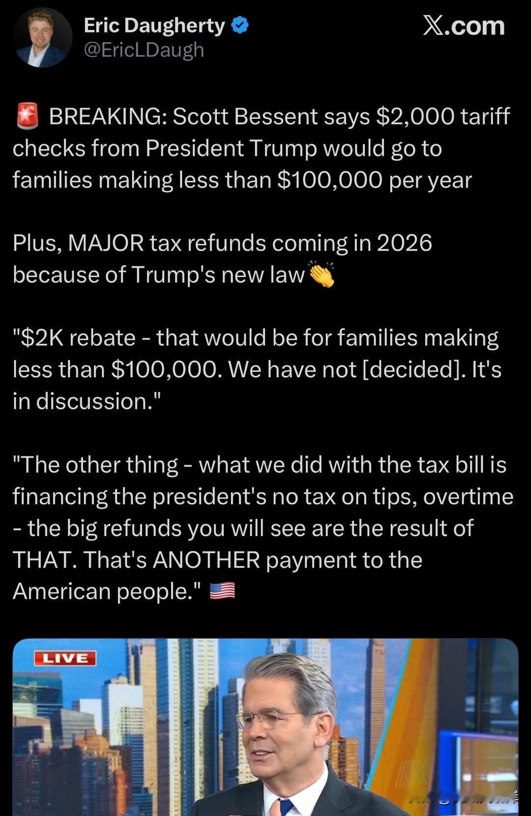 突发新闻:Scott Bessent 表示,川普总统提出的 2000美元关税退税支票 将发放给 年收入低于10万美元的家庭。 此外,2026年还将有重大税收退款,因为川普的新法律: - “2000美元退税——那是给年收入低于10万美元的家庭的。我们还没有[最终决定],仍在讨论中。” - “另一件事是——我们在税法案中所做的,是为总统的‘无小费税、无加班费税’政策提供资金。你们将看到的大额退税,正是那一政策的结果。那是对美国人民的又一笔支付。”