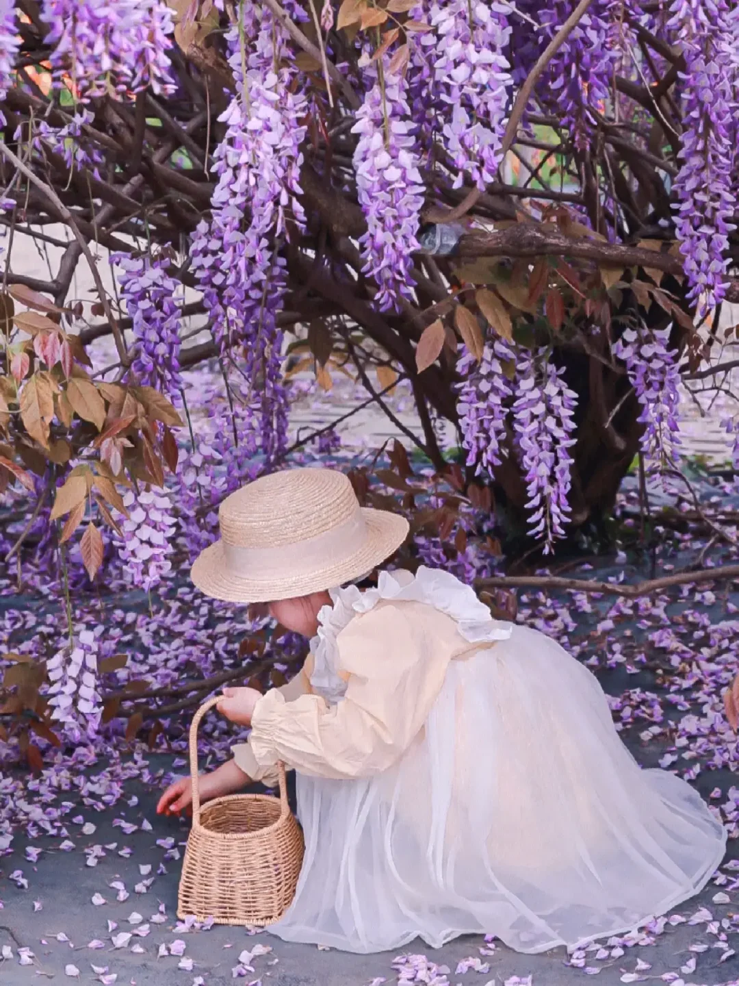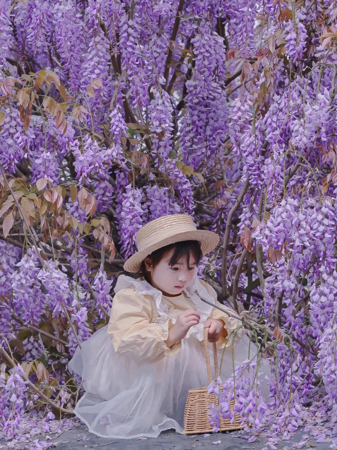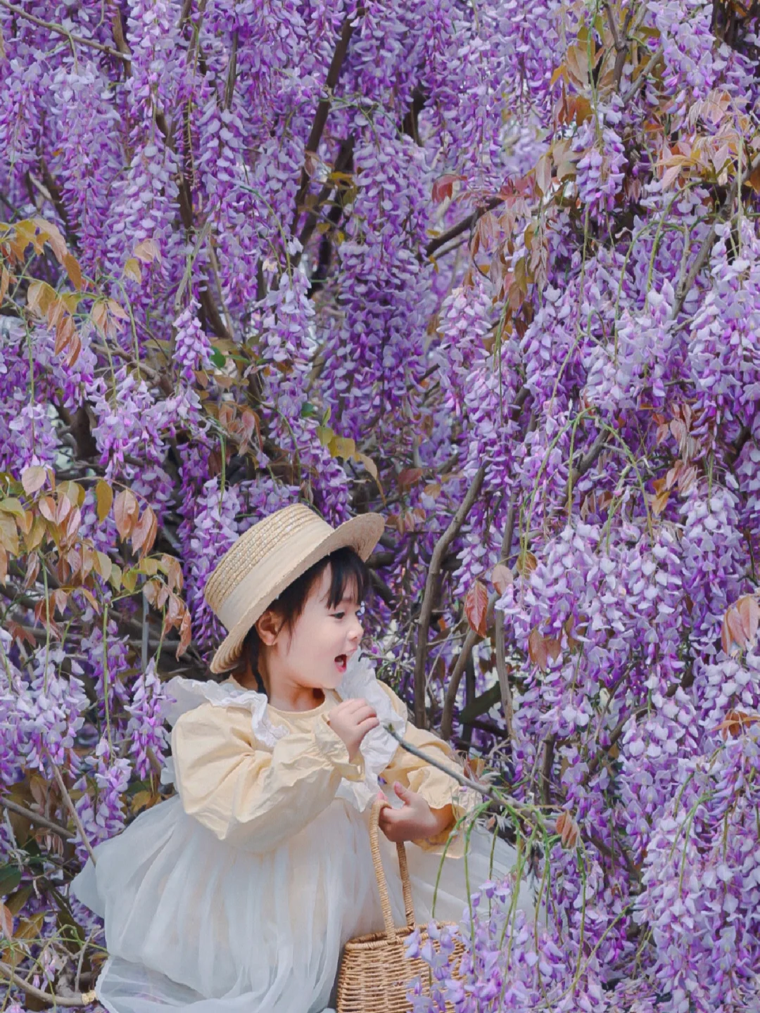 嗨,我是喜欢带娃出游的豆芽麻麻,最近真的被成都的各种花花所包围啦,本想着去海蒂和噜噜的花园拍木绣球,但却意外被这这颗紫藤花树吸引了,看着地上满满一地的紫色花瓣,豆芽便钻进花藤中捡起了“掉在地上的春天”