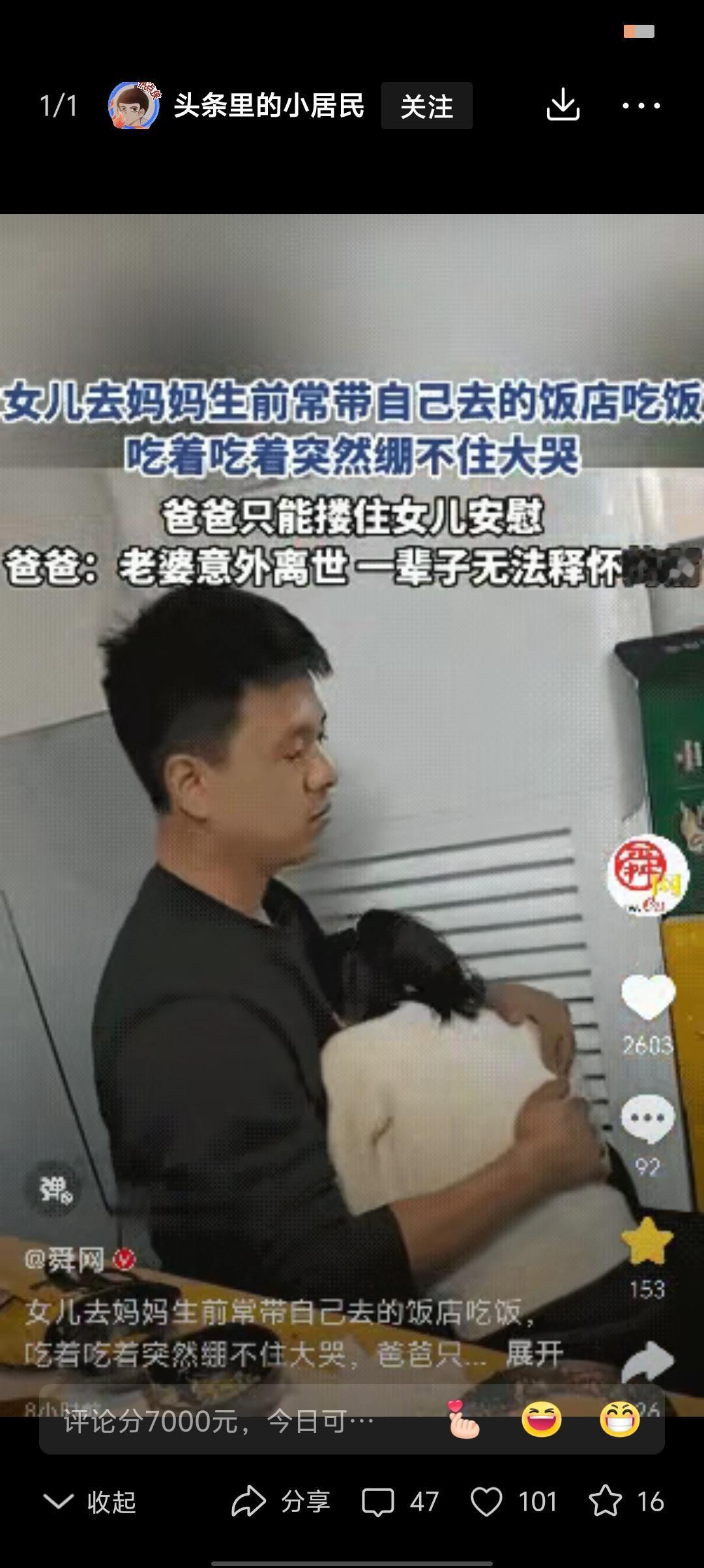 泪目了,河北,一位爸爸带着女儿去经常去的饭店吃饭,女儿吃着吃着,突然绷不住了,大哭起来,原来她想妈妈了,可她妈妈已经不在了…… 一位爸爸带着女儿去一饭店吃饭,却没想,她吃着吃着就大哭起来,原来是孩子触景生情了,想妈妈了,可她再也见不到她妈妈了。她妈妈去天堂了。 有网友说:这个故事就像一面镜子,让我们反思自己对待家人的态度。我们应该珍惜和家人在一起的每一刻,多关心他们,多陪伴他们。因为生命是脆弱的,意外随时可能发生,不要等到失去了才懂得珍惜。同时,我们也应该向小女孩学习,在困境中依然保持善良和感恩,用自己的方式去关爱家人。愿小女孩和爸爸能够在未来的日子里,带着对妈妈的思念坚强地生活下去,也希望每一个家庭都能平平安安,幸福美满。 这个故事如镜,让我们反思对家人的态度,珍惜相伴时光、多关心陪伴,向困境中仍善良感恩的小女孩学习,愿她与爸爸带着对妈妈的思念坚强生活,每个家庭都平安幸福! 世界上最伟大的最无私的爱,就是母爱,世上只有妈妈好!没有妈妈的孩子令人心疼心酸! 教育孩子:妈妈没有死,只是提前去了一个地方生活,人们是迟早都会要去的地方,教小孩不要伤心难过,要自强生活 大家怎么看呢?