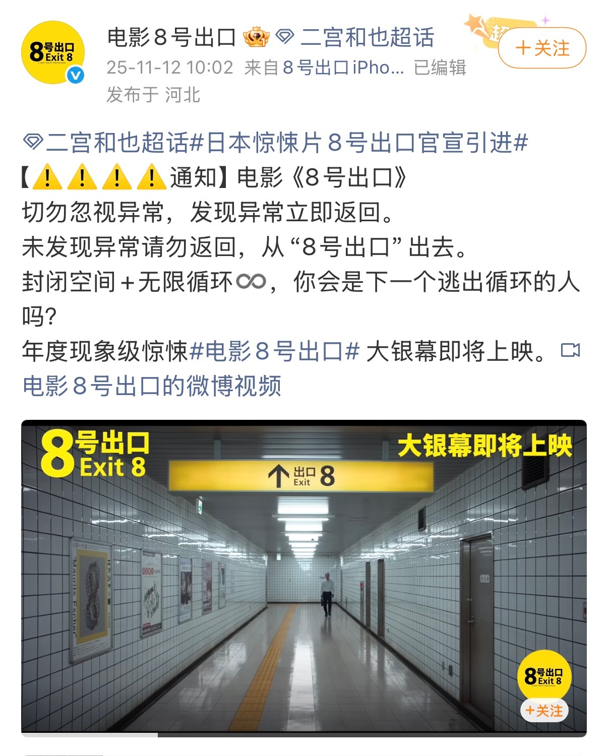 日本惊悚片《8号出口》官宣引进,等待定档,虽然这部电影口碑很差,但是策略是对的,多多引进不同国家不同类型的电影有助于增长票房。