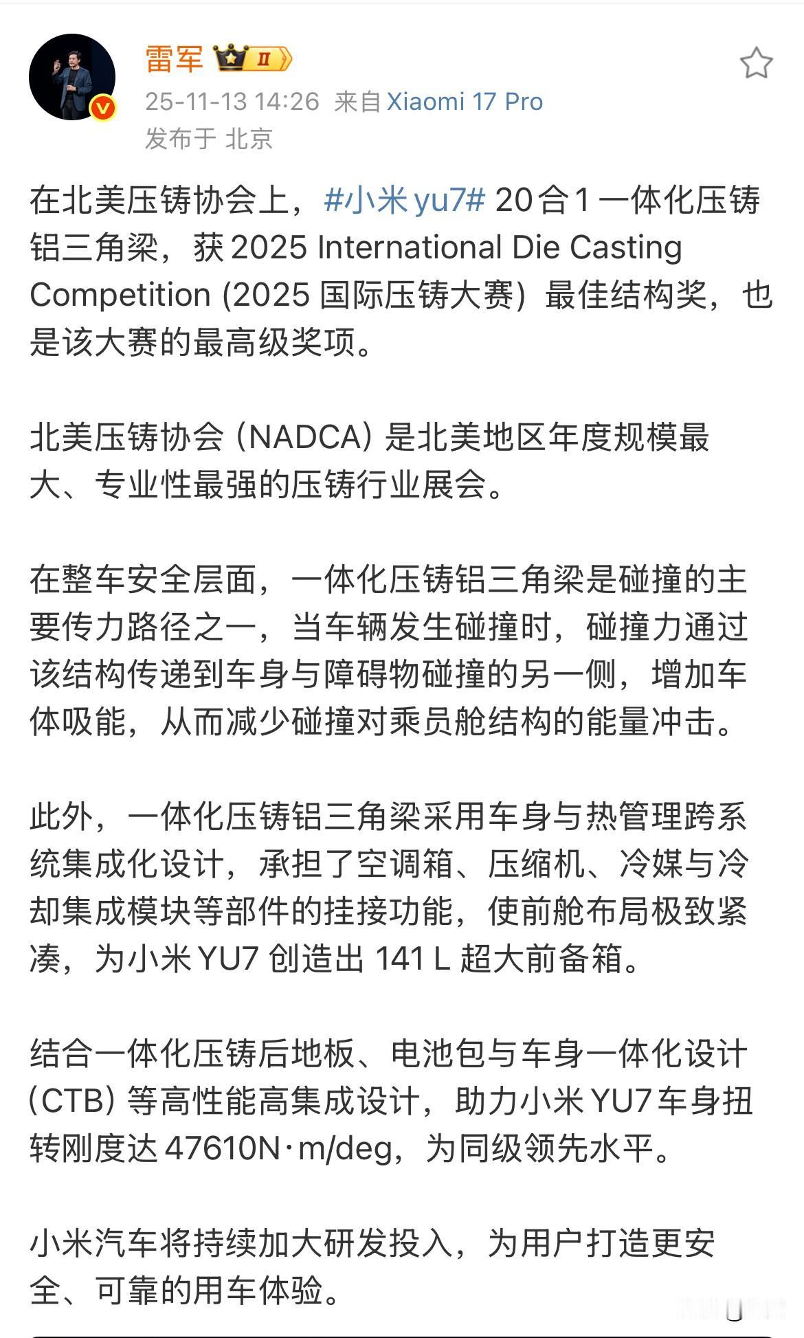 雷军: 小米YU7获得2025 国际压铸大赛,最佳结构奖,也是该大赛的最高级奖项🥇 就在刚才,雷军在社交网络上给大家普及了这个知识点! 因为既然他们获得了奖项,很多人却不知道这到底是一个啥概念,所以雷军基本上用很大的篇幅都在普及他们这个小米SUV的汽车结构,为什么能够获得这个奖! 以及这个奖,它的含金量到底怎么样,看来小米还是懂得去参加各种评选的,对我们国内的用户来说,要不是小米参加这个选项,估计好多人都不知道,在北美居然有一个压铸协会! 也不知道我们国产新能源汽车这么多品牌,他们有没有去参加相应的评选,因为基本上我们每隔一段时间,就能看到小米的汽车,不管是SUV还是SUV,都能够获得各种各样的奖,只要是真正有技术的有含金量的,都没问题,只不过可能对于真的想买这个汽车的朋友来说,获得再多的奖,都不如他亲自体验到不同给他不同的感受。 大家从另外一个层面来看,一个能够不断地获得各种各样的奖,说明他确实是优秀的,这一点是毋庸置疑的,但从这个角度来看的话,我们国内的其他同行还得加油鼓劲,把自己的产品做好一点,这样大家都能够多多少少获奖。