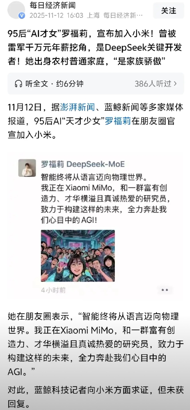 传了一年,主角罗福莉终于发朋友圈证实了之前的传言是真的,果然从来就没有什么空穴来风,只是需要一个跳出竞业协议的过程而已。 只是,抛开宣传和营销需要不说,对Al赛道而言,招一个执行者的意义在哪里? 一个项目的核心目标和深层逻辑,往往只有牵头的领导者最清楚,团队更多是在这个基础上推进执行。但大厂的分工模式很容易让员工陷入“局部经验”——比如为了达成某个目标拆分出10个步骤,5个人各司其职,有人可能只专注做第3、4步,长期下来只熟悉单一环节,缺乏全流程的视野和落地能力。 当这类员工如果跳槽到需要独立覆盖1-5步全链路的公司,恐怕很容易习惯性照搬之前的局部工作方法,很难适配新场景的全流程需求,不过,对双方来说,的确满足了流量效应了。