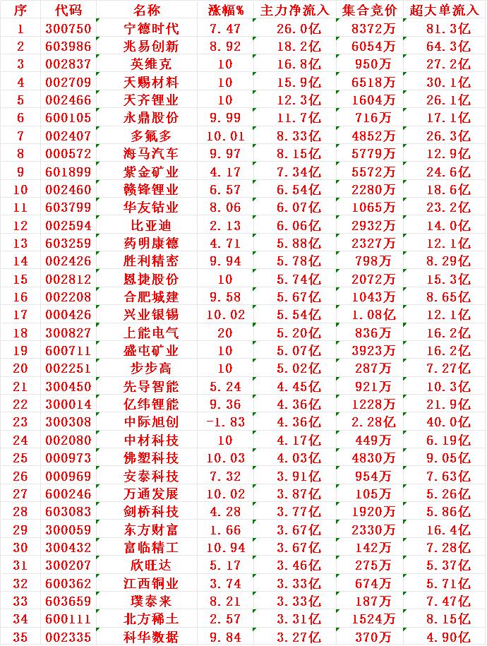 11月13日收盘,主力,已经大幅卖出的35名单: 香农芯创,净流出8.64亿元; 阿特斯,净流出4.74亿元; 上海电力,净流出4.64亿元; 中国中冶,净流出4.18亿元; 中粮糖业,净流出3.51亿元; 万向钱潮,净流出3.19亿元; 好上好,净流出3.12亿元; 科翔股份,净流出3.10亿元; 中国平安,净流出2.97亿元; 东百集团,净流出2.73亿元; 天际股份,净流出2.63亿元; 永太科技,净流出2.58亿元; 华钰矿业,净流出2.55亿元; 拓荆科技,净流出2.49亿元; 捷佳伟创,净流出2.46亿元; 振华股份,净流出2.39亿元; 兴森科技,净流出2.36亿元; 福龙马,净流出2.17亿元; 方正电机,净流出2.17亿元; 百川能源,净流出2.16亿元。 11月13日收盘,主力资金“大幅买入”的35名单: 宁德时代:净流入26.0亿元,超大单流入81.3亿元; 兆易创新:净流入18.2亿元,超大单流入64.3亿元; 英维克:净流入16.8亿元,超大单流入27.2亿元; 天赐材料:净流入15.9亿元,超大单流入30.1亿元; 天齐锂业:净流入12.3亿元,超大单流入26.1亿元; 永鼎股份:净流入11.7亿元,超大单流入17.1亿元; 多氟多:净流入8.33亿元,超大单流入26.3亿元; 海马汽车:净流入8.15亿元,超大单流入12.9亿元; 紫金矿业:净流入7.34亿元,超大单流入24.6亿元; 赣锋锂业:净流入6.54亿元,超大单流入18.6亿元。