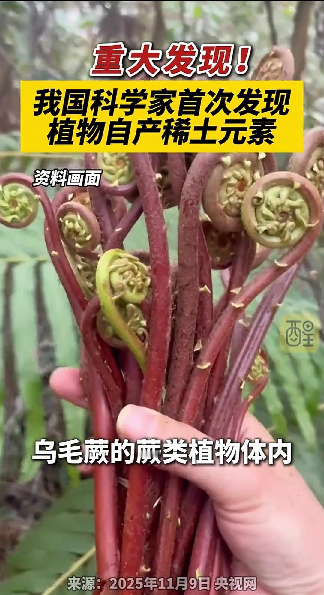 国运来了挡都挡不住!谁能想到,平时随处可见的乌毛蕨,被我国科研人员一研究,直接炸出世界级大发现 —— 这玩意儿不仅能 “吸” 稀土,还能让稀土在自己体内 “搭积木”,自动组装成 “镧独居石” 矿物!路边不起眼的野草,竟藏着 “稀土金矿”,这不是国运来了是什么?挡都挡不住! 11月5日报道,我国科研团队在南方山区考察时,本来是想研究 “植物为啥能在稀土多的土壤里活”,结果意外发现乌毛蕨体内的稀土含量高得离谱,比普通植物高出几百倍! 更绝的是,用高科技仪器一照,这些稀土元素居然不是乱飘的,而是在细胞间自己凑一起,形成了稳定的 “镧独居石”—— 这可是稀土矿里才有的核心矿物! 以前挖稀土那叫一个难!可乌毛蕨这波 “神操作”,直接颠覆了传统模式:它能精准 “捕捉” 土壤里的稀土,还能自动提纯组装,以后说不定种一片乌毛蕨,就能收获一批稀土矿物,又环保又省钱,简直是老天爷赏饭吃! 不光解决了稀土开采的环保难题,还打破了国外的资源争夺!现在全球都在抢稀土资源,有了这 “植物采矿” 的黑科技,以后不仅不用怕被卡,还能掌握稀土提取的主动权! 以后新能源汽车、国产大飞机、先进武器的核心部件,都能用上我们自己低成本、高环保的稀土,国家发展这不就如虎添翼吗? 可能有人问,这乌毛蕨真有这么厉害?科研人员说了,已经反复验证过,乌毛蕨的根系有特殊 “吸附能力”,能把土壤里的稀土元素 “抓” 进来,再通过细胞间的特殊机制,让稀土离子自己排列组合,形成结晶矿物。 好比植物自己建了个 “稀土加工厂”,从原料到成品一步到位,比人工提纯还精准!而且乌毛蕨在南方到处都是,不用专门培育,只要找到稀土富集的地方种上,就能当 “天然矿场” 用,简直是低成本高回报的典范! 我们的科研人员是真的牛!不盯着热门领域跟风,反而从不起眼的野草里挖宝藏,这就是咱们的科研智慧 —— 接地气、解决真问题! 以前总有人说 “中国只会模仿”,现在咱用事实打脸:全球首次观测到植物体内稀土自我组装,这可是实打实的原创突破,老外想抄都没地方抄! 这就是国运的体现,国家越来越强,科研投入越来越大,科研人员才能沉下心搞研究,才能干出这种震惊世界的大事! 以前觉得 “国运” 是虚的,现在才明白,国运就是我们的智慧和努力,是从野草里挖宝藏的惊喜,是打破垄断的硬气!有了这样的科研突破,稀土领域再也不用受牵制,环保难题也能解决,国家发展只会越来越顺! (每天更新,欢迎关注,喜欢文章的可以帮忙点个赞留条评~) 对此大家有什么看法?