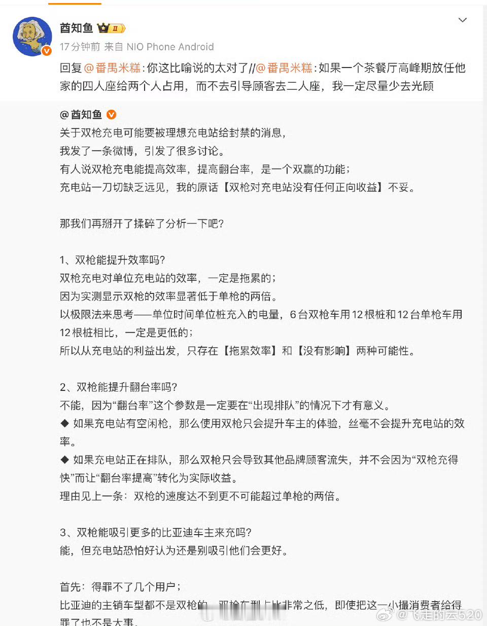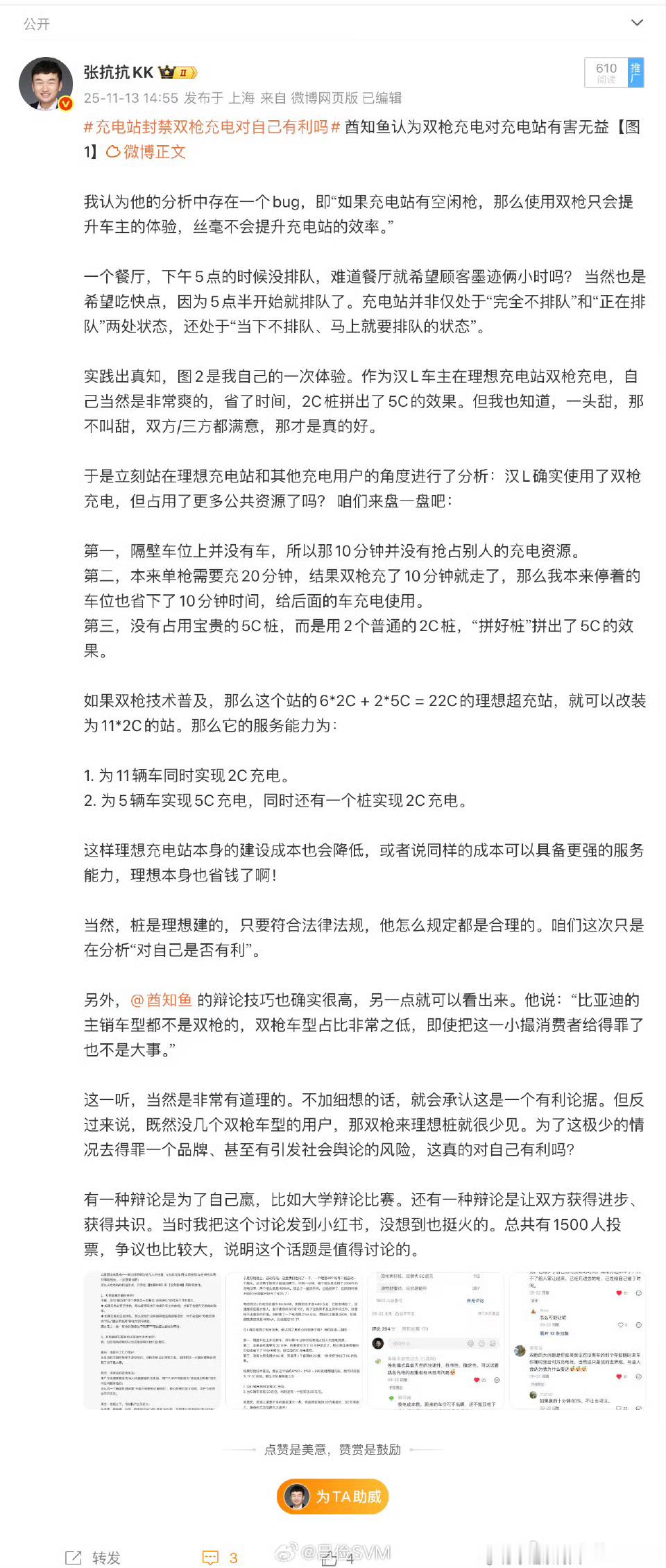 和 聊了一个有趣的话题我的观点:封禁双枪充电,会让充电站的利益受损。两方面:一、张抗抗提到的闲时向忙时过渡的时候,双枪充电能带来更快的翻台时间。减少进入忙时的排队情况。二、双枪充电的热损耗更高,对于充电站来说,充满同样的电池,充电站能卖出更多电,就能够获得的收益就更高。发热功率简化成P=I^2*R双枪充电就相当于是两倍的电流,发热的功率达到了原来的4倍,而充电时间减少为原来的一半。理论上总的发热量会翻倍。再加上电池充电的电流越大,会导致内阻越大。又会导致总体发热量的上升。所以之前通过很多兆瓦闪充的视频,我也分析过,大电流的充电会让整体的充电效率大幅度下降。因为发热量翻倍还不止,热能的损耗是充电桩提供的电能。把这些电池包里面产生的热能通过压缩机排出电池包,还需要消耗电能。所以双枪充电大约能使每100度电的电池充满电多消耗5~10块钱。对于充电站来说,支持双枪充电能够提供更好的翻台率,还能提高这些双枪充电车辆的收益,何乐而不为呢?