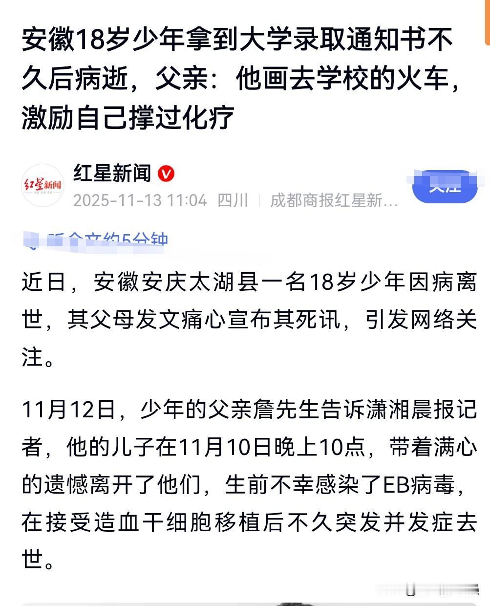 世界不是公平的,每个人的人生没有公平可言。 这真的是太不幸了。 少年拿到大学录取通知书不久后病逝。 这是个非常有才华的男生,又聪明,画画又好,字也写得好。 但偏偏不幸感染了疾病。 让这个家庭真的是人财两空。 疾病太可怕了。 这是一个心痛的事情,最痛苦的莫过于孩子的父母。