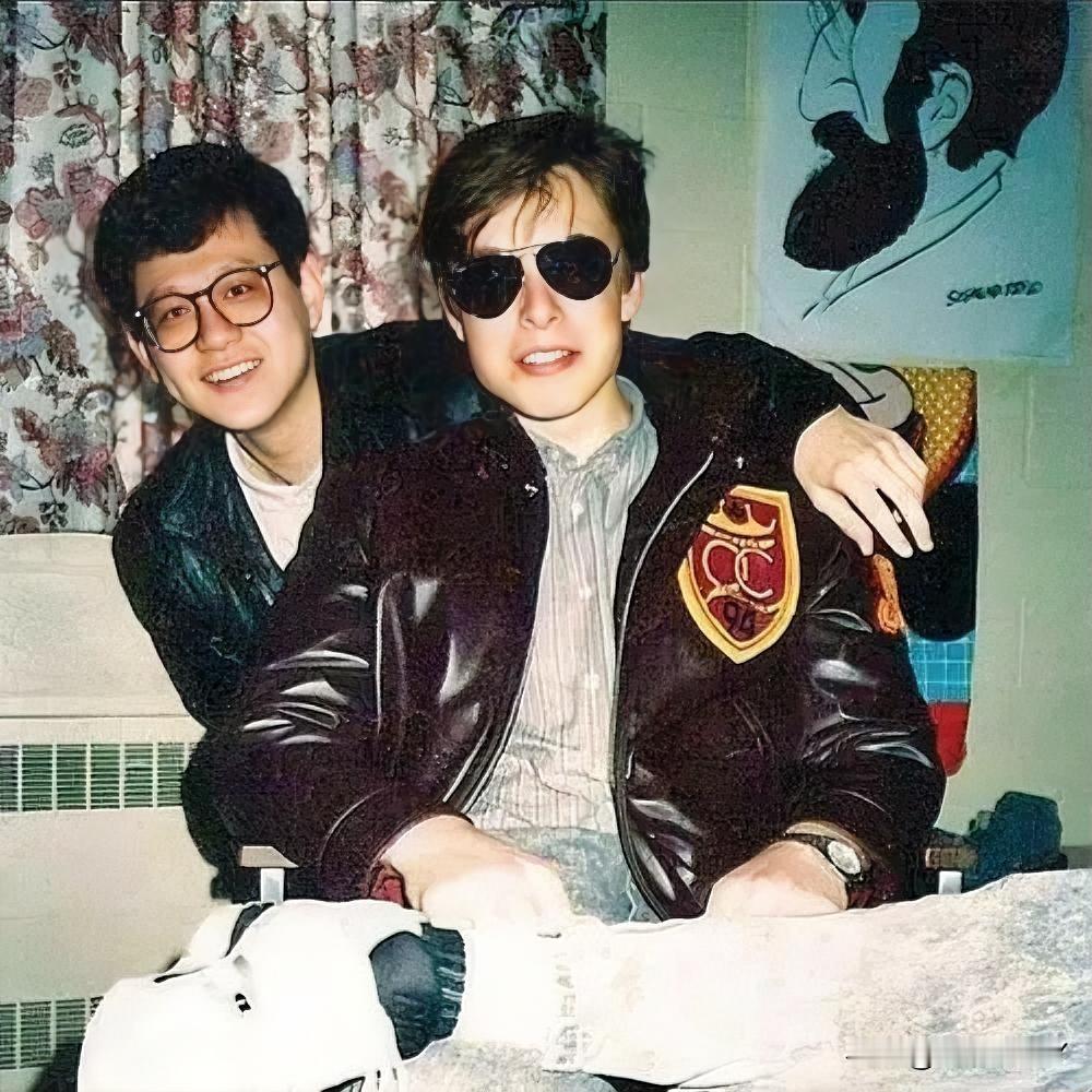 1990年,18岁的马斯克与他的室友在宿舍的合影旧照。马斯克17岁那年勇闯天涯跑到加拿大,当了一年背包侠之后,就读于皇后大学,住在学生宿舍,照片中的男生是他室友,看起来很熟悉,大家知道他是谁么?