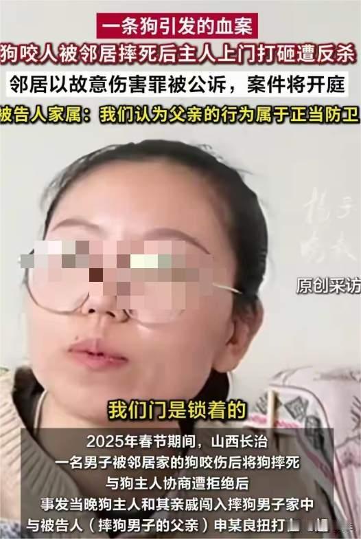 山西男子被狗咬伤后续:狗主人上门打砸,更多细节被曝,家属回应 2025年春节,山西长治一男子被邻居的狗咬伤,出于自保将狗摔死。邻居不满,拒绝协商,并与亲戚闯入男子家中打砸,导致男子父亲被围殴。 男子父亲在被逼迫中用刀刺伤邻居郭某某,导致其身亡。此案引发热议,家属各执一词,男子家属认为符合正当防卫,而邻居家属则认为是故意伤害。该案将在2025年11月13日开庭审理,律师将为男子父亲辩护。