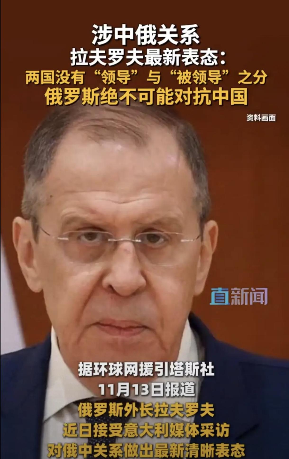 11月13日,俄罗斯外交部长拉夫罗夫在接受意大利媒体采访时明确表示:俄中关系不存在“领导”与“被领导”的区别,俄罗斯绝不可能与中国对抗。这一表述再度清晰地传达出俄中平等互信、稳定协作的关系基调。