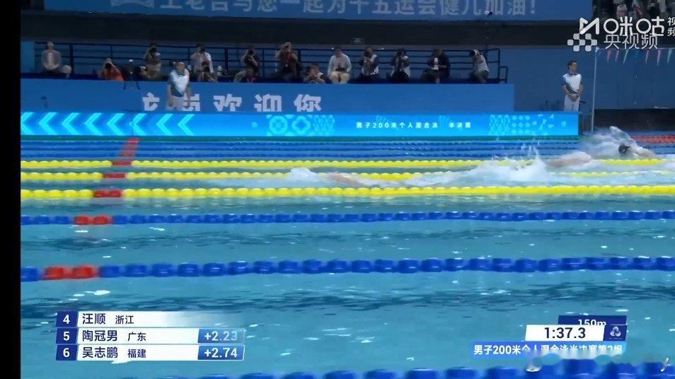 全运男子200米个人混合泳半决赛,快满32岁的浙江老将汪顺以2:00.10的总成绩排名第一晋级决赛,河北何宇博2分01秒04第二,广东陶冠男排名第三。