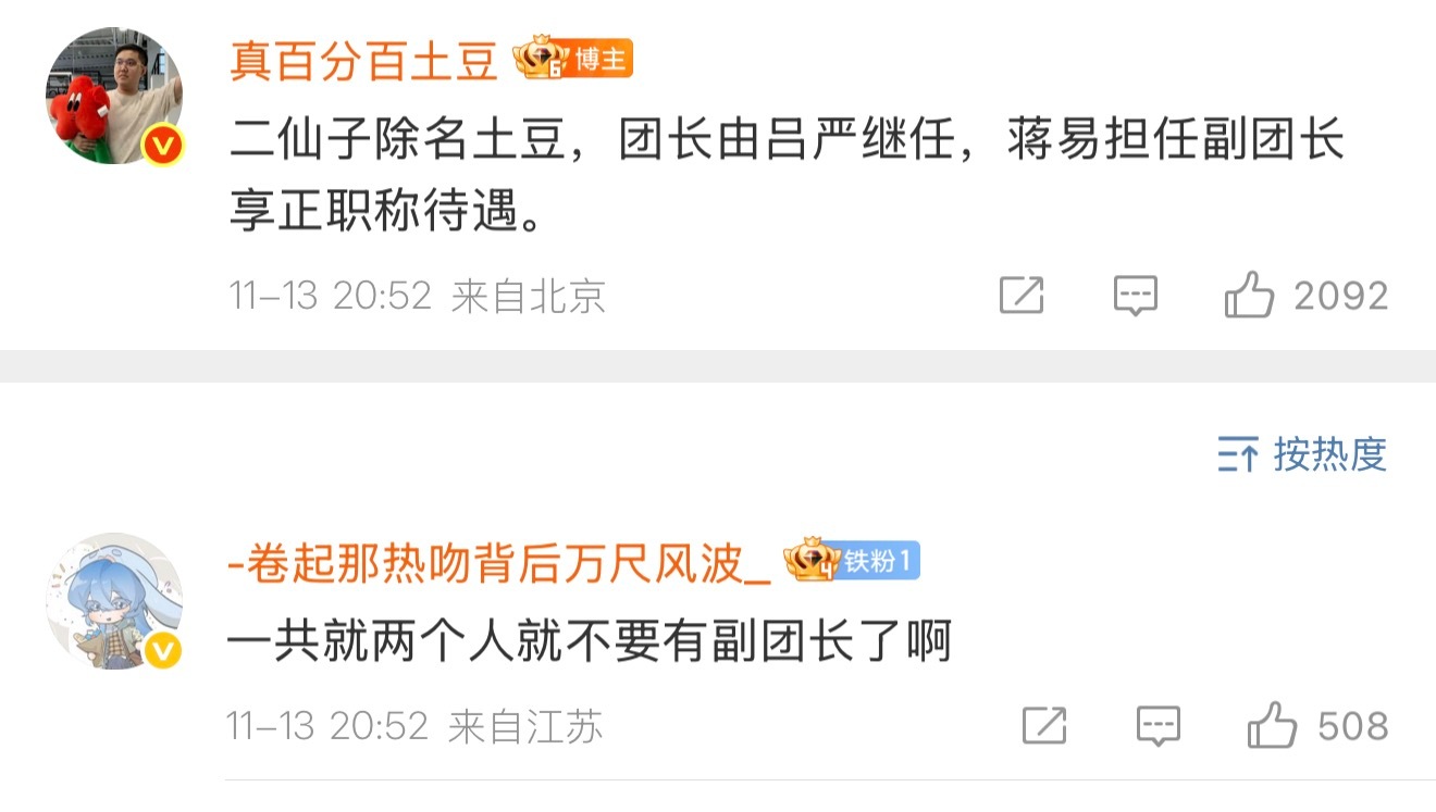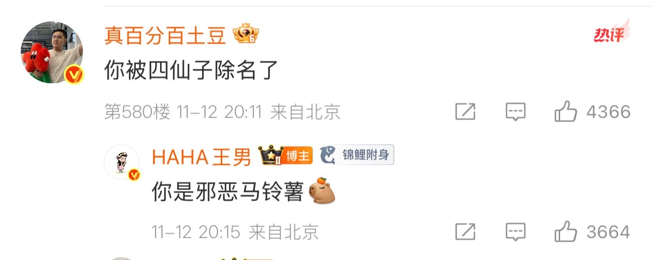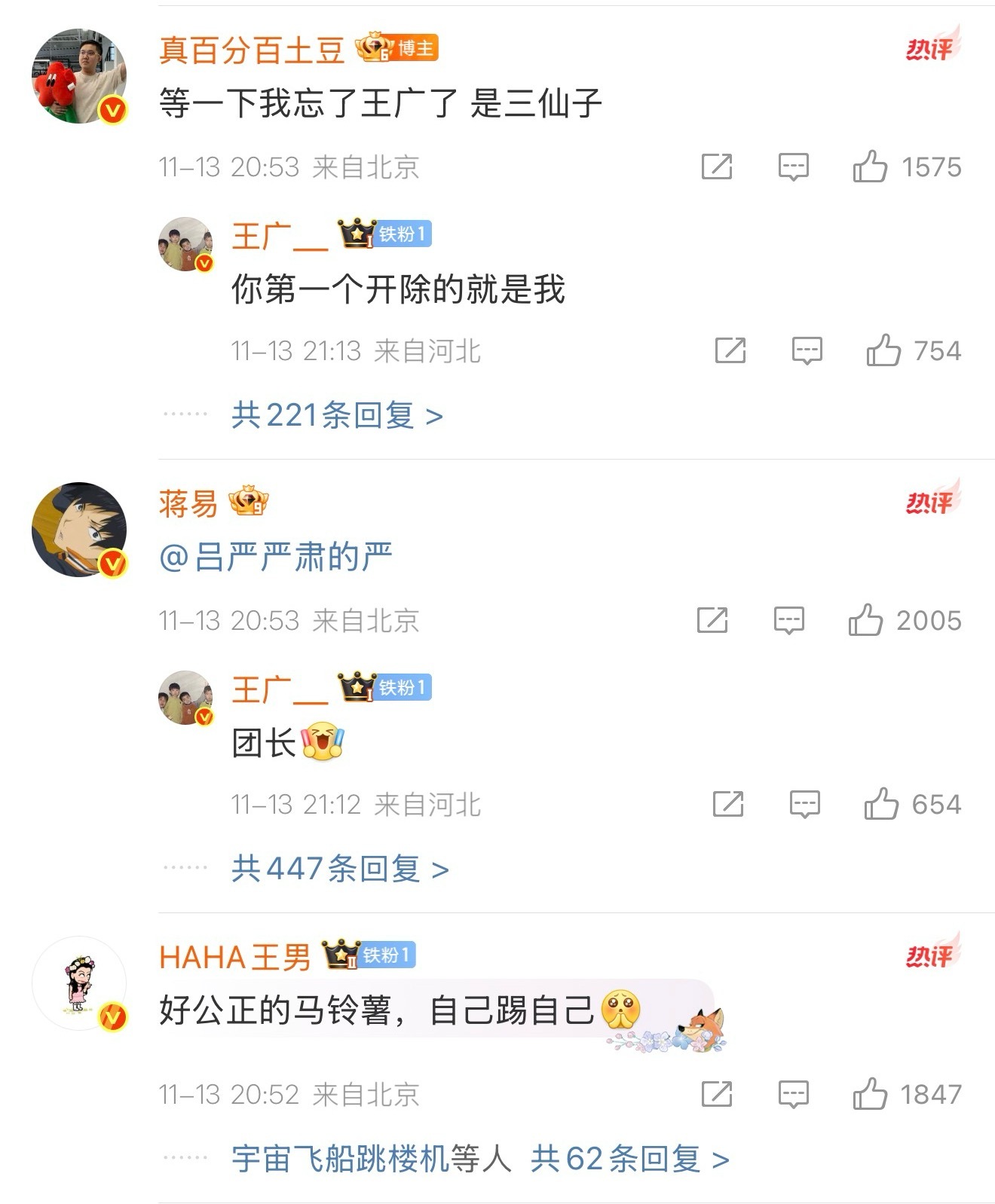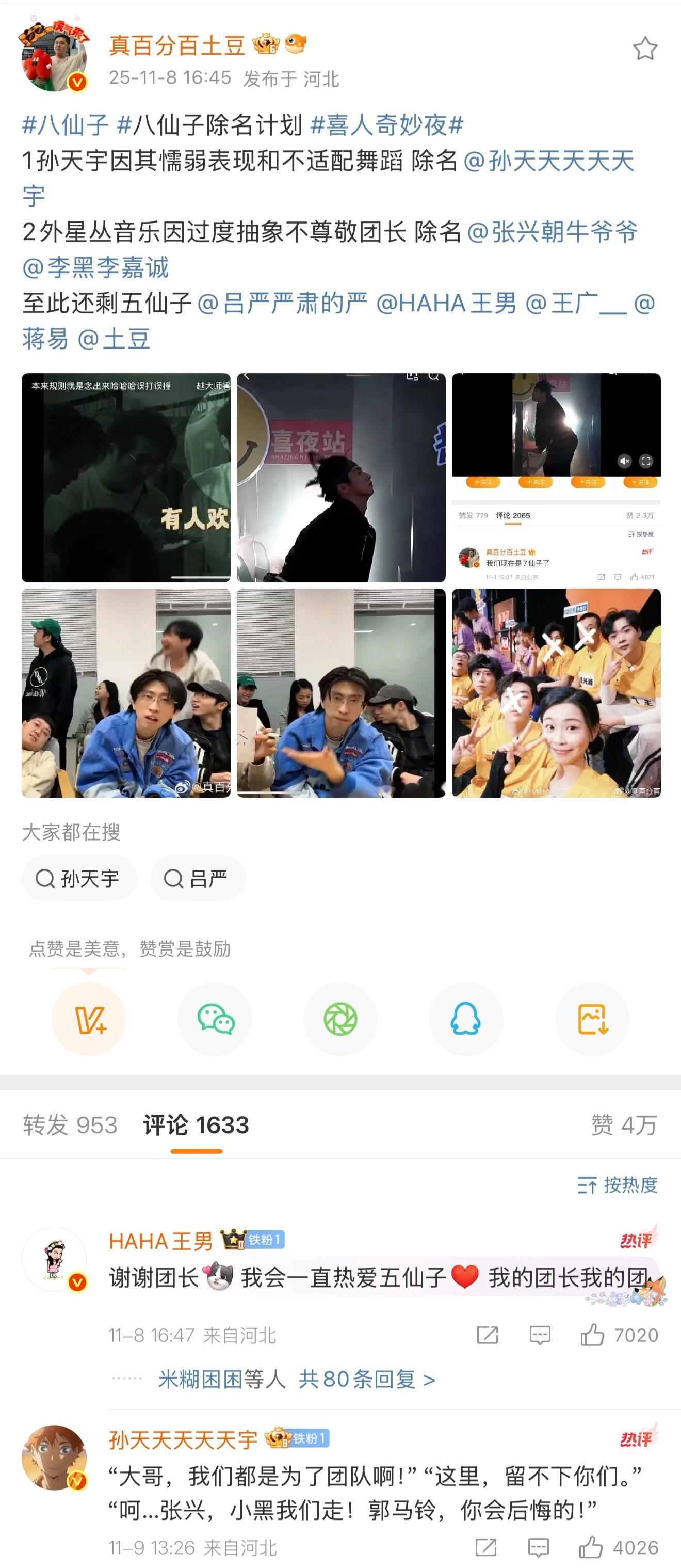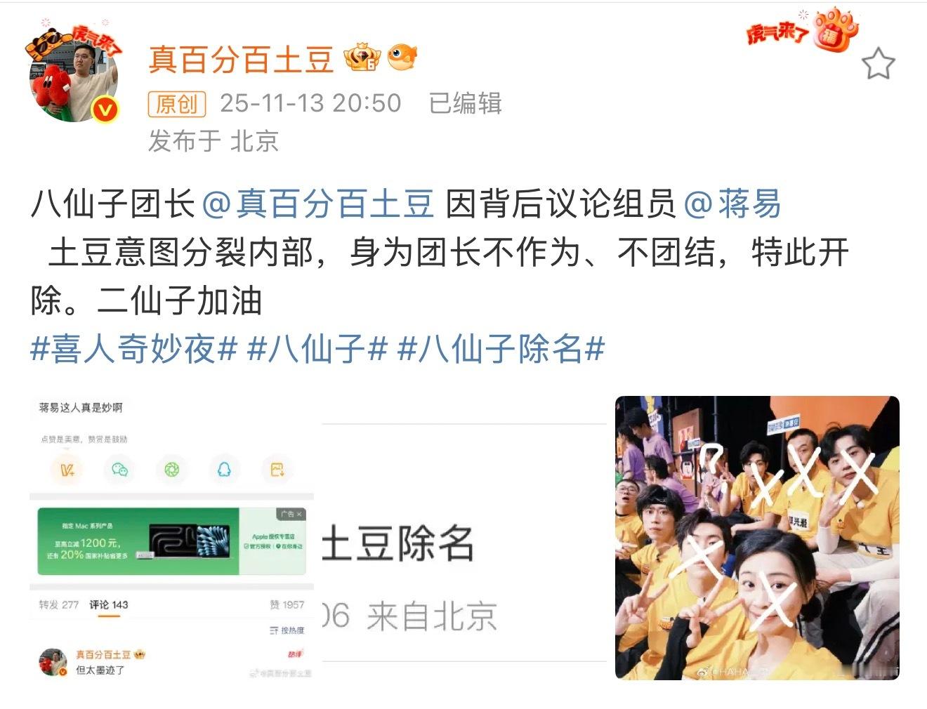 疑似八仙子以除名的方式解散告别10.20王广 被土豆除名11.8 孙天宇 张兴朝 李嘉诚 被土豆除名11.12 王男 被土豆除名11.13 土豆 被蒋易除名(但吕严正宫位置稳坐