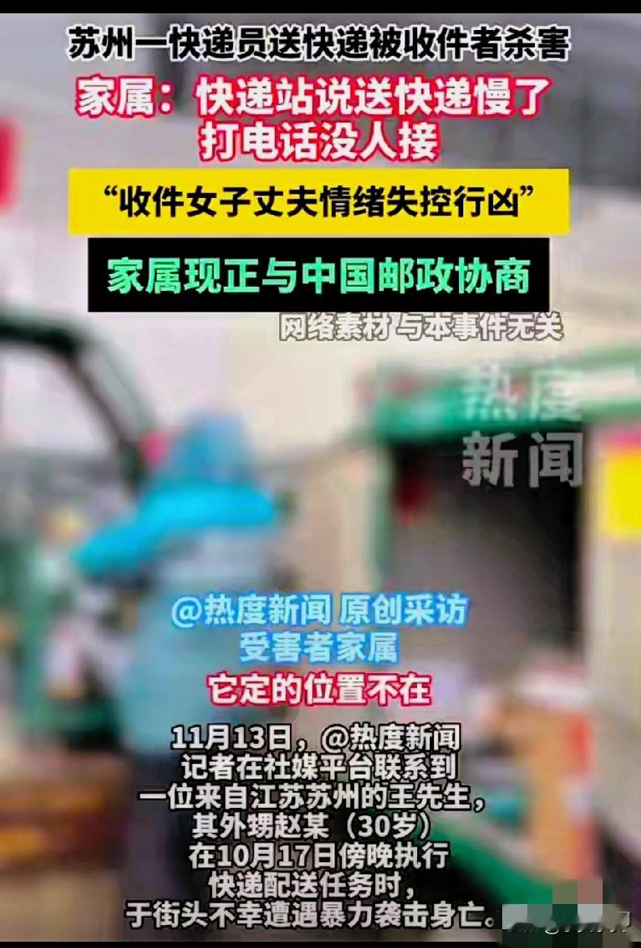 几百米的偏差让快递员送命:邮政快递员上门送件遭收件人灭口 一次寻常的快递配送,却因几百米的定位偏差,让30岁的快递员小李付出了生命的代价。11月13日,来自江苏苏州的王先生向热度新闻记者哭诉,自己的外甥小李在10月17日傍晚配送快递时,与收件人丈夫发生口角,最终被对方持刀刺死。 据王先生介绍,小李是中国邮政苏州某网点的正式员工,已与公司签署劳务合同,日常负责当地片区的快递投递工作,工作认真负责的他从未与客户发生过冲突。然而10月17日晚上7点左右,一场意外的配送偏差打破了平静——由于快递定位出现误差,小李将收件人吴女士的快递,投递到了距离其家约几百米的唯亭金陵西路唯亭二中附近点位。 发现送错后,小李第一时间意识到问题,多次主动拨打吴女士的电话,想要说明情况并协商后续处理方式,可电话始终无人接听。直到拨打数次后,吴女士的丈夫才接通电话。此时因配送超时,吴女士已情绪激动地从家中赶往现场,见到小李后,双方随即发生了口角争执。 谁也没有想到,这场因快递配送引发的纠纷,会朝着致命的方向发展。争执过程中,吴女士丈夫的情绪突然失控,竟持刀对小李实施了暴力行凶。现场目击者见状惊慌失措,第一时间拨打了110报警电话和120急救电话。遗憾的是,小李伤势过重、失血过多,经急救人员现场全力抢救无效,当场宣告死亡。 一个年轻的生命戛然而止,背后是一个家庭的崩塌。原本只是几百米的配送偏差,本可以通过耐心沟通妥善解决,却因一时的情绪失控酿成无法挽回的悲剧。快递配送中难免出现意外,双方多一份理解与包容,少一份戾气与冲动,或许就能避免悲剧发生。 目前,相关案件仍在进一步处理中,但这起悲剧已引发不少人深思:当日常纠纷发生时,如何守住情绪的底线?如何用理性沟通替代暴力冲突?愿这起悲剧能敲响警钟,让更多人懂得克制冲动、尊重生命,让类似的悲剧不再重演。