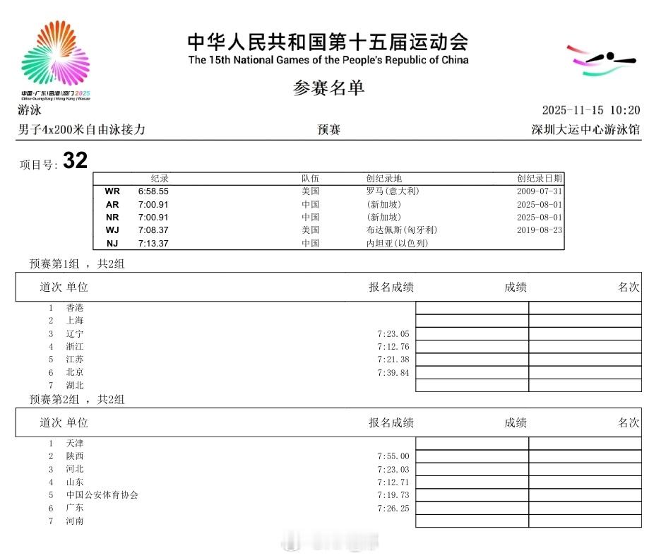 女4x200自接预赛河北 8:03.81浙江 8:05.35广东 8:06.45